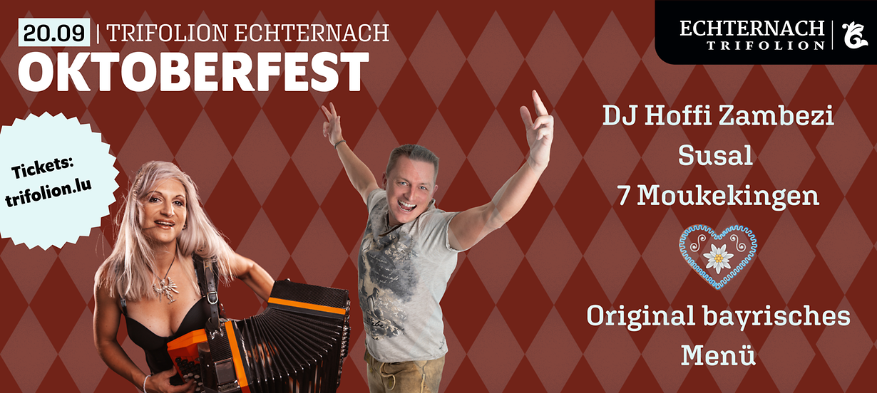 Mia derfa mit Freid verkünd’n: Des Trifolion Echternach werd zur Wiesn! Zum allererst’n Moi überhaupt wird aus’m Kultur- und Kongresszentrum a gscheide boarische Gaudi – beim Oktoberfest Echternach 2025.