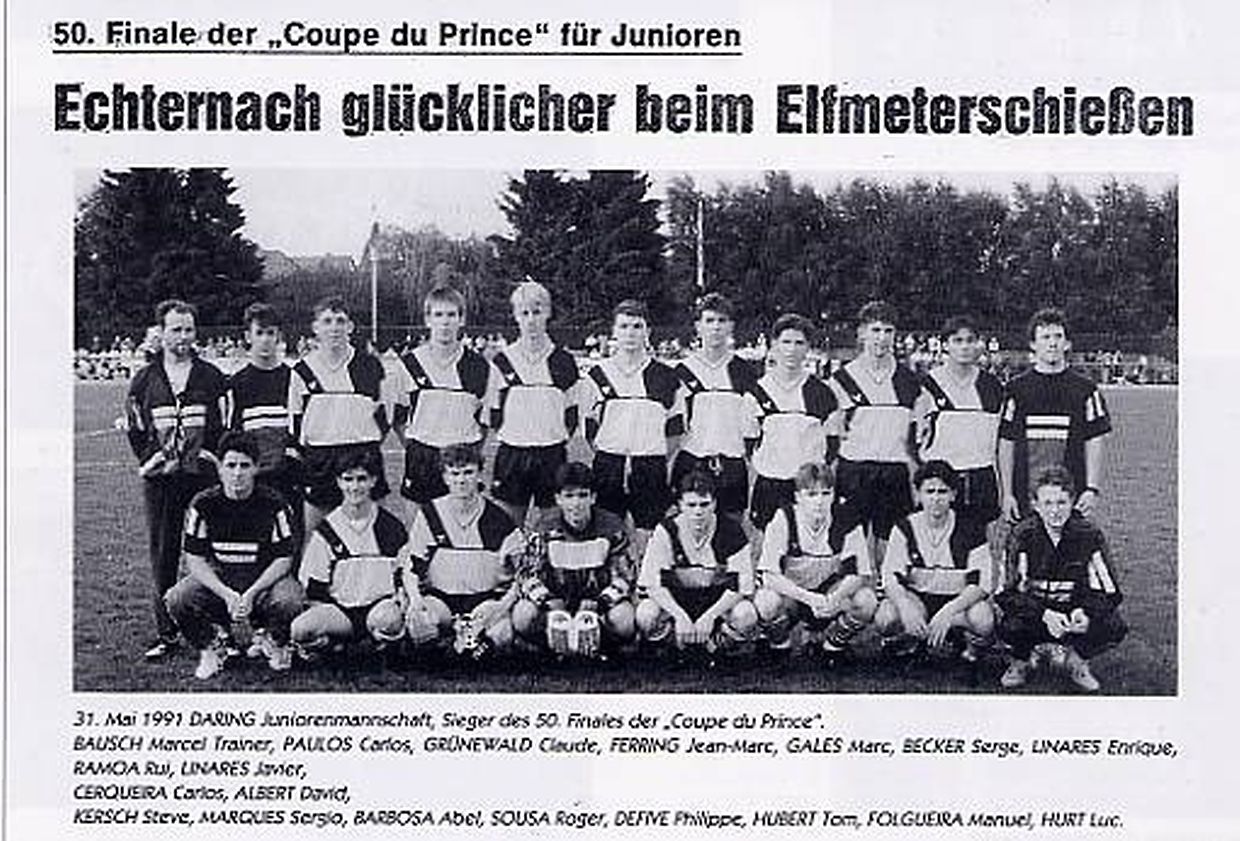 In diesem Zusammenhang soll auch an dieser Stelle erwähnt werden, dass die Junioren im Jahre 1959 Finalist der „Coupe du Prince“ waren. Das Endspiel wurde am 7.Mai 1959 im hauptstädtischen Stadion, vor der imposanten Kulisse von 4.500 Zuschauern , ausgetragen. Gegner waren die Alterskollegen der „Jeunesse“ aus Esch-Alzette, die dieses Finale mit 3:1 gewannen. Im „LW“ zog anderntags der Chronist das Fazit: Diese Leistung der Daring-Junioren wird in Echternach unvergessen bleiben.