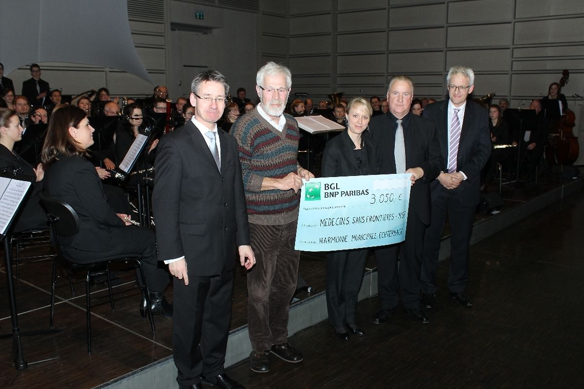 In der Pause dieses anspruchvollen Konzertes überreichte Fernand Theisen, Präsident des Musikvereins, einen Scheck in Höhe von 3 050 Euro an Peter Firmenich, Verwaltungsmitglied der „Medecins sans Frontières“.