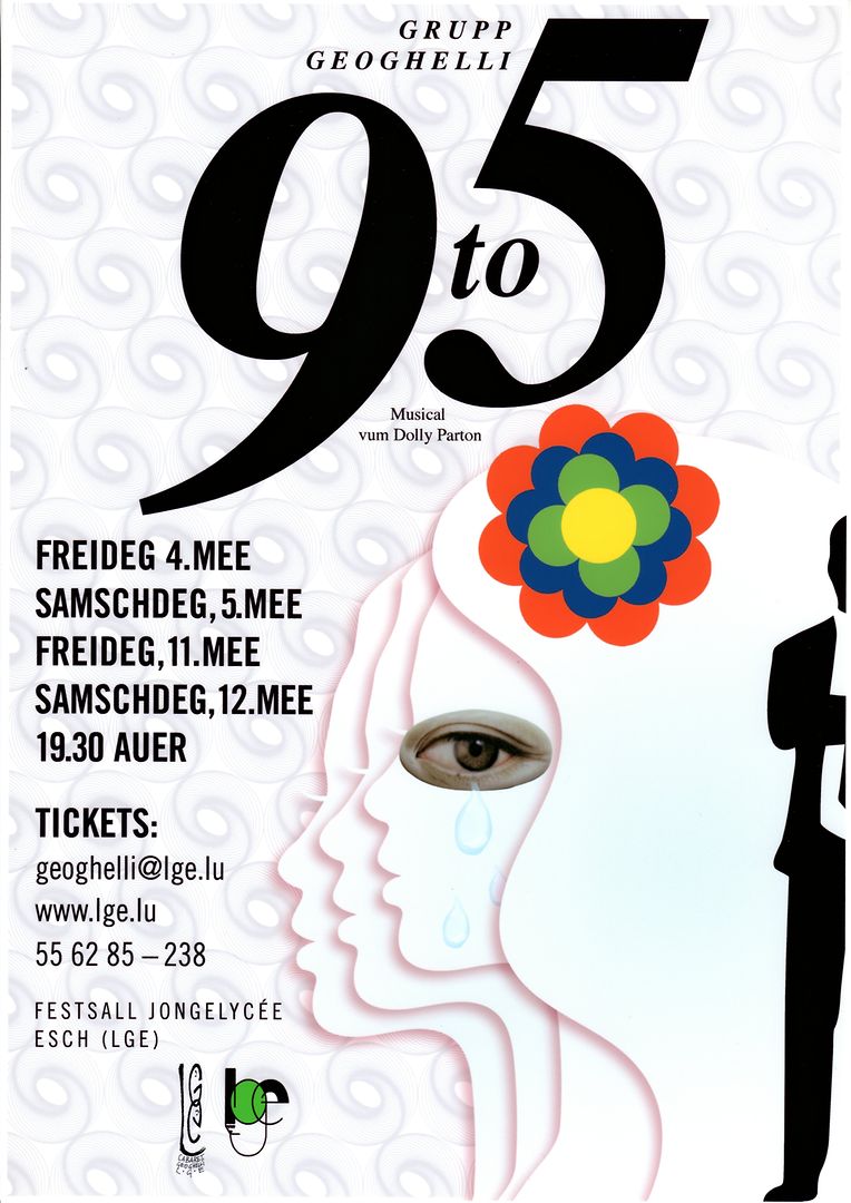 Die Vorstellungen von ‚9 to 5‘ finden statt am 4., 5., 11. und 12. Mai jeweils um 19.30 Uhr im Festsaal des Lycée de Garçons Esch/Alzette (Eingang Spitalstrasse). Eintrittskarten gibt es im Vorverkauf während der Bürostunden im Schülersekretariat des LGE, Telefon 55 62 85 -238, im Internet auf www.lge.lu und per mail an geoghelli@lge.lu. Der Eintritt für Erwachsene beträgt 15.-€, für Kinder, Schüler und Studenten 10.-€. Spieldauer 2 Stunden 10 Minuten plus Pause. ‚9 to 5‘ ist geeignet für Kinder ab 8 Jahren. Das Stück wird in deutscher Sprache aufgeführt, indes die Lieder in englischer Sprache live gesungen werden.