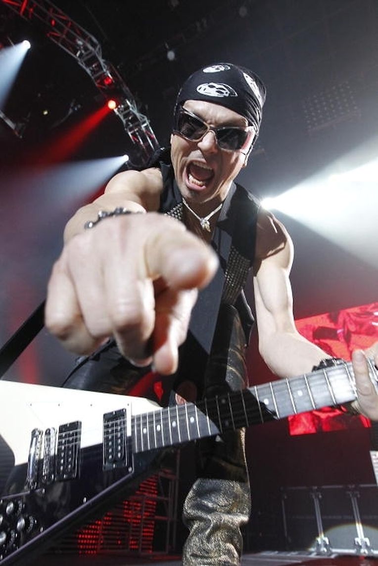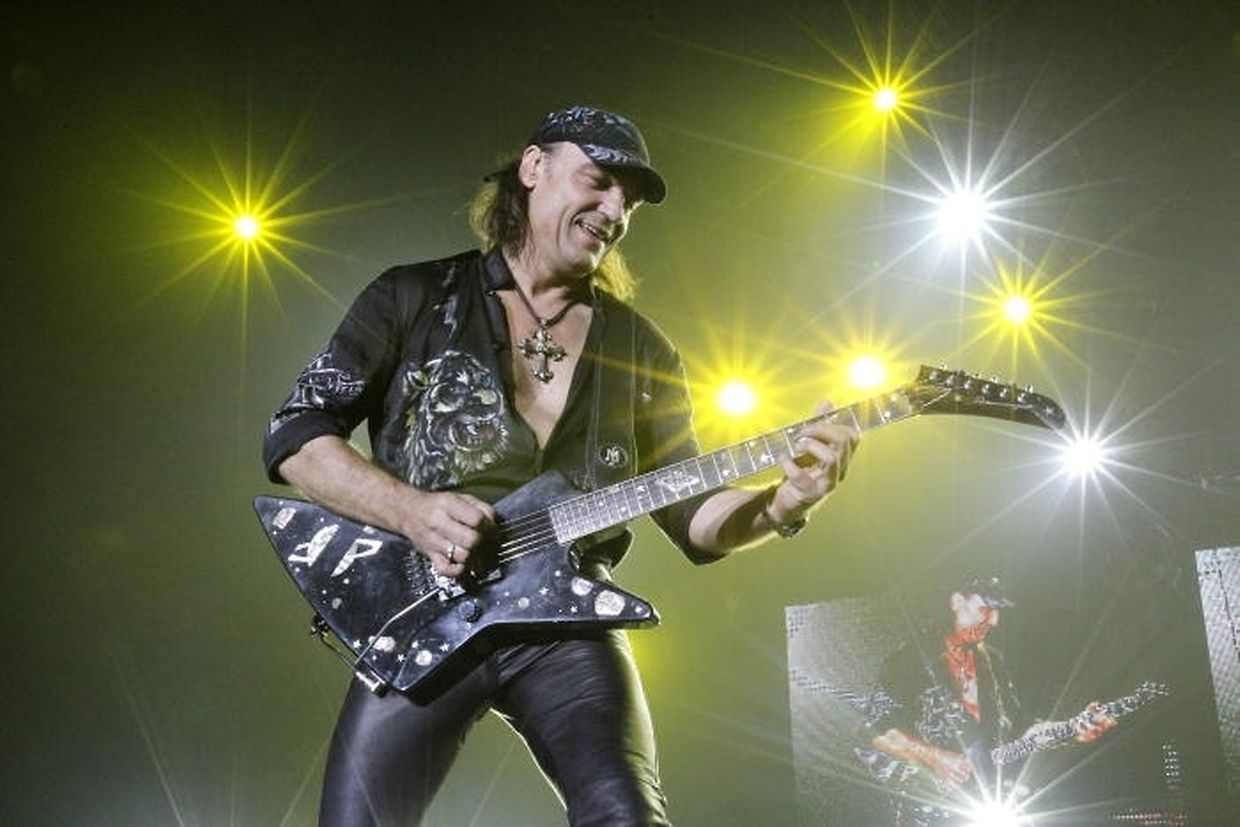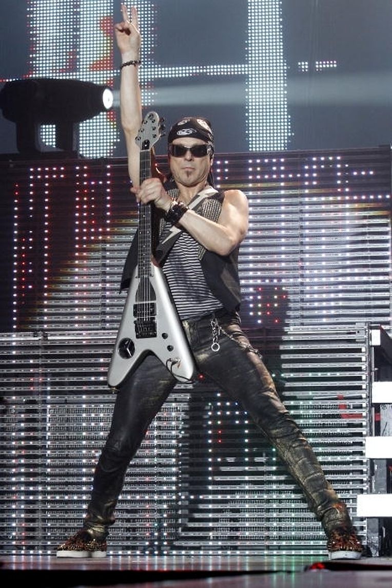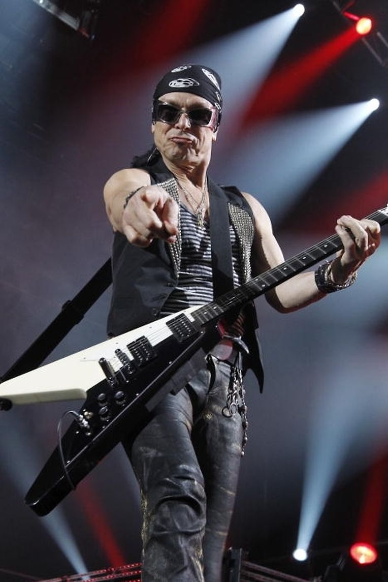 Der dritte Altmeister im Bunde ist Matthias Jabs (55), der für nahezu jedes Lied eine andere Gitarre parat hat, darunter die von ihm selbst kreierte Mastercaster, ein klanglich und handwerklich sehr stimmiges Instrument, das im Verbund mit Schenkers klassisch-futuristischen Flying-V-Gitarren zum charakteristischen Sound der Scorpions beiträgt.