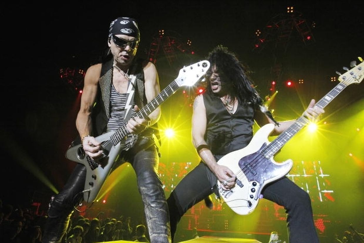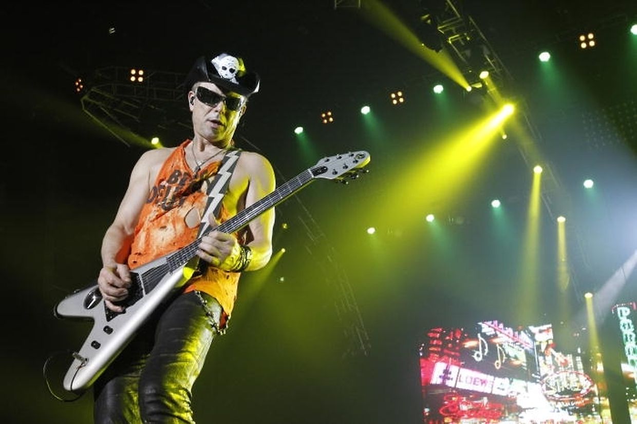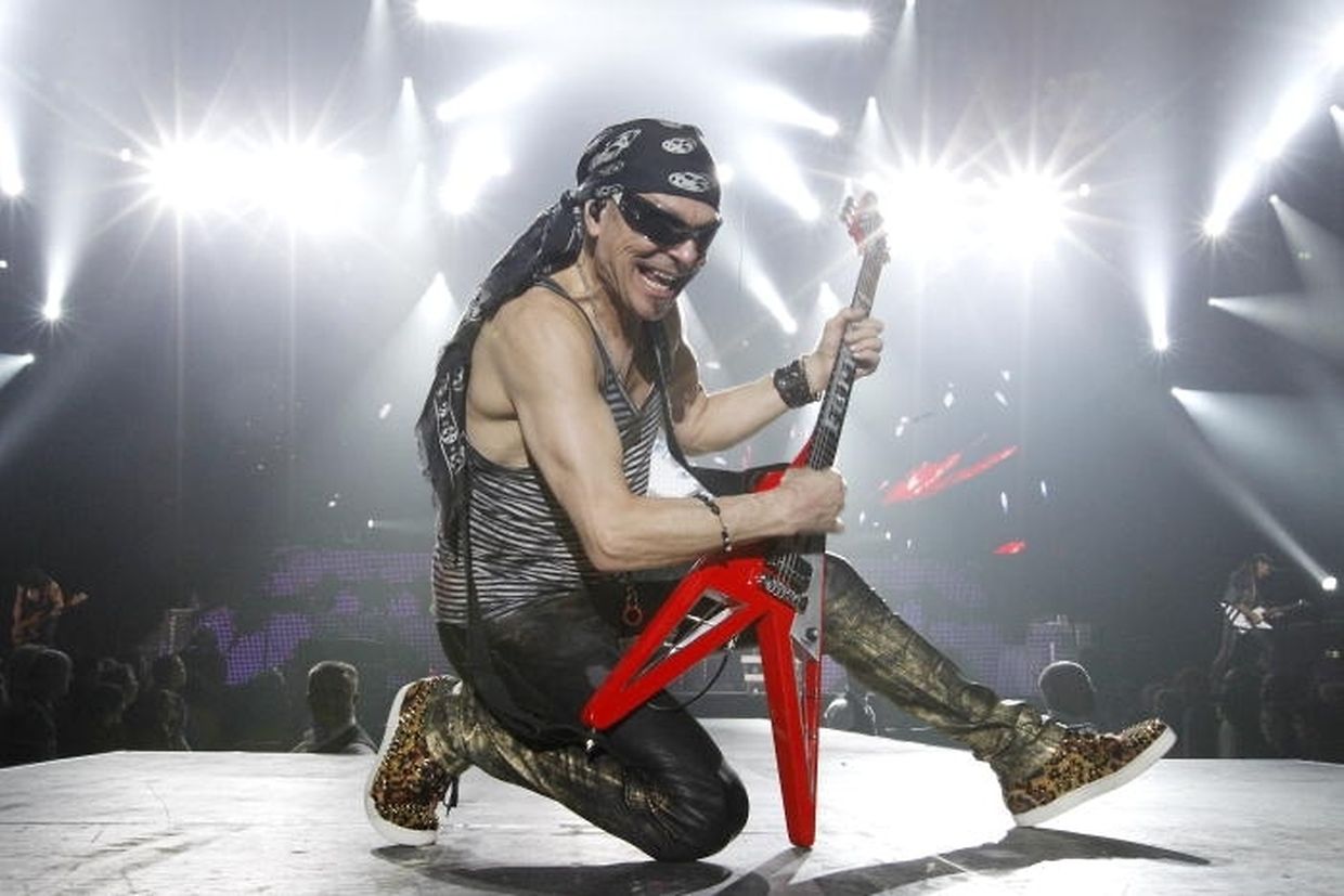 Der dritte Altmeister im Bunde ist Matthias Jabs (55), der für nahezu jedes Lied eine andere Gitarre parat hat, darunter die von ihm selbst kreierte Mastercaster, ein klanglich und handwerklich sehr stimmiges Instrument, das im Verbund mit Schenkers klassisch-futuristischen Flying-V-Gitarren zum charakteristischen Sound der Scorpions beiträgt.