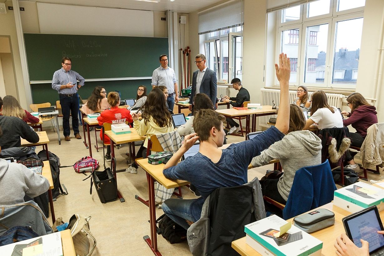Viru kuerzem huet d’ Klass 5.2 hir Ipads kritt. Si sinn eng Projetsklass aus dem LHCE am Kontext vum „Digital Classroom“. Equipéiert mat engem Ipad sollen si, zesumme mat hire Proffen, d’Benotzung an den Ëmgang mat der neier Technologie am Schoulalldag ausprobéieren.