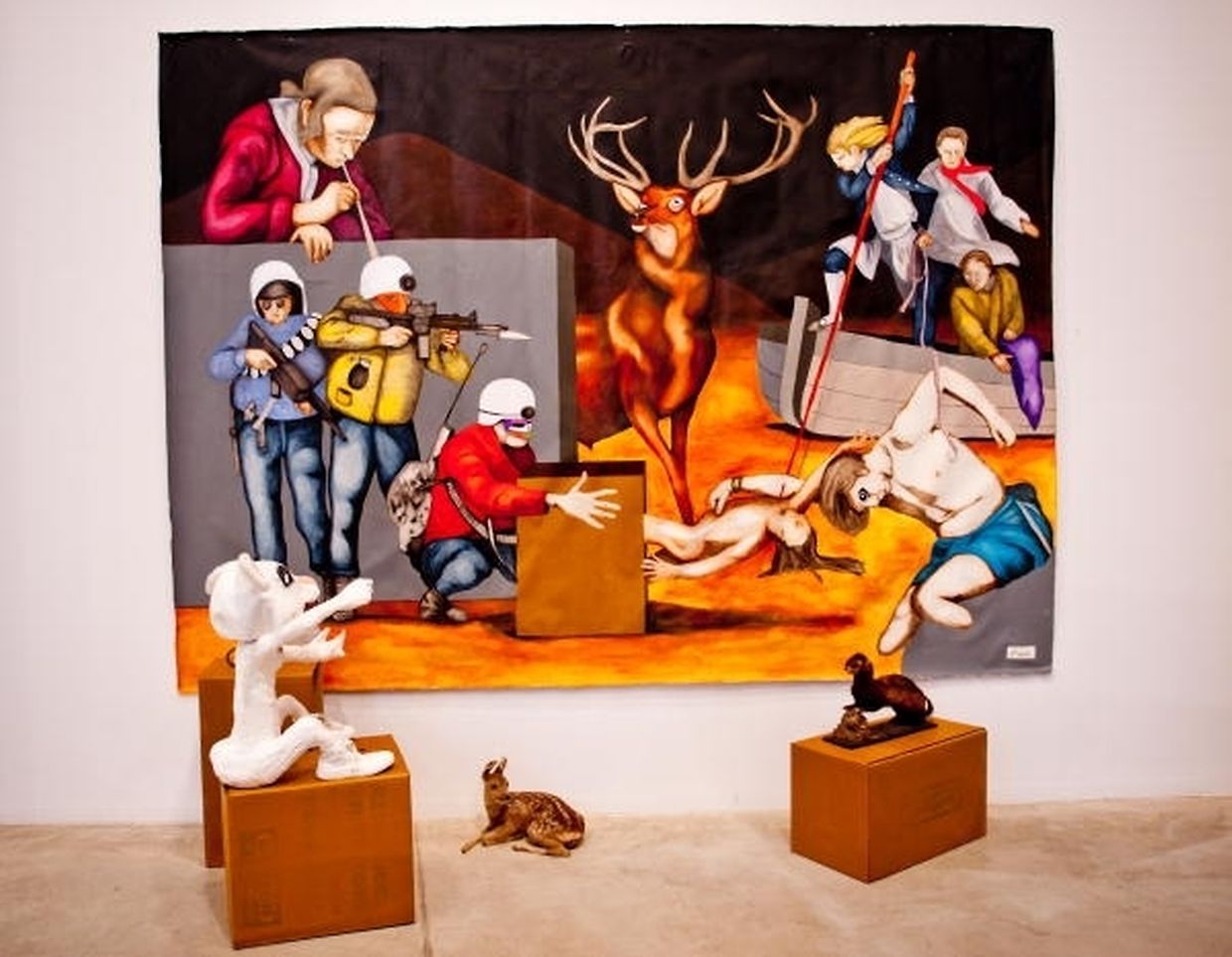 Alors, il est évident que les œuvres de l'artiste ne vont pas se diaprer de pastel. Ses compositions à la palette terne, sombre, délavé sont comme les oripeaux d'une société en déliquescence. Si nous recherchons le beau, le décoratif, l'esthétique, nous devons passer notre chemin car nous ne le trouverons pas dans cette exposition.