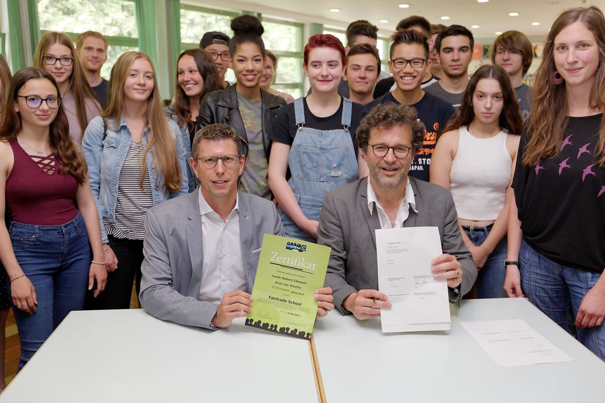 Am Freitag, den 12. Juni konnte die Direktion des Lycée Hubert Clément im Beisein der Vertreter von Fairtrade Luxemburg, Herrn Jean-Louis Zeien (Präsident) und Frau Valérie Klein, die Fairtrade-Konvention unterschrieben. Schon während des vergangenen Jahres fanden verschiedene Aktivitäten zur Sensibilisierung der Schülerinnen und Schüler für die Problematik des Fairen Handels statt.