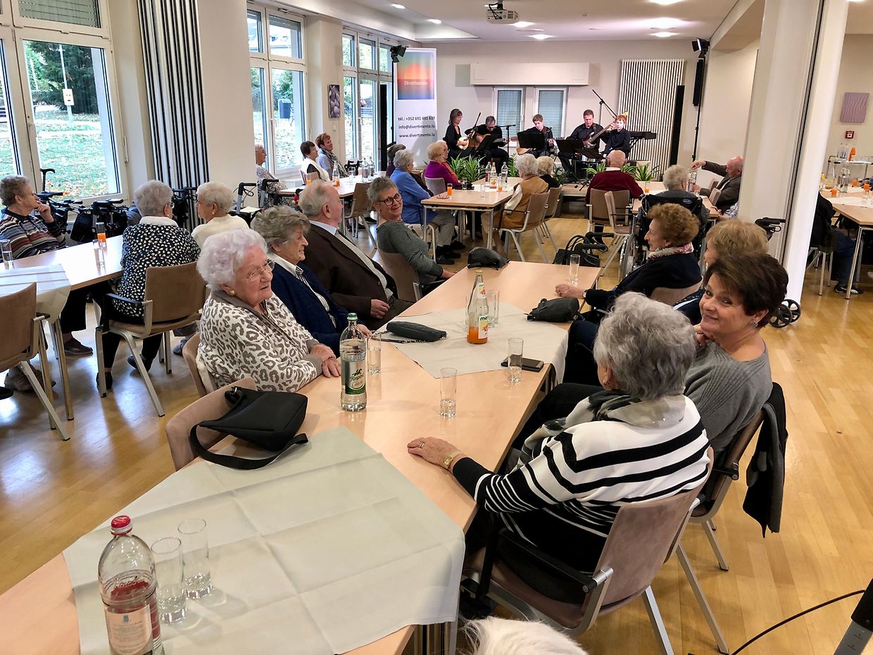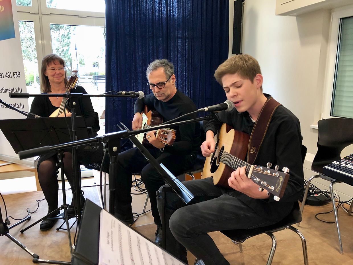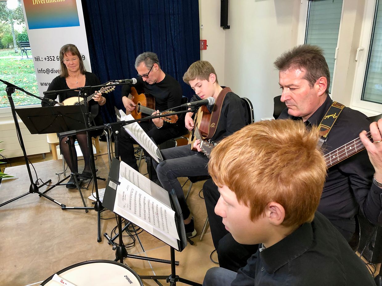 Das Musikensemble Divertimento gastierte einmal mehr im CIPA Esch "op der Leier" um den Anwohner des Heimes einen gemütlichen musikalischen Nachmittag zu bereiten. Unter der Leitung von Isabelle Merlevede spielten sich die Musiker mit bestbekannten Melodien in die Herzen der zahlreichen Leute, die sehr aufmerksam und sehr interessiert die gelungenen Darbietungen verfolgten. Oft wurde mitgesungen oder sogar der Takt mitgeschlagen. David Di Bartolo, einer der jüngsten im Ensemble, erntete mit seiner Gesangseinlage von "Love yourself" sehr viel Applaus. Genauso erging es Ben Wagner mit seinem attraktiven Marimba-Spiel bei "Marry You", "Mamma Mia" und "The Rose". Mit dem Weltsong "Hallelujah" von Leonard Cohen liess Enrico Lunghi alle Herzen schneller schlagen. Die Basseinlagen auf der E-Gitarre von Vincent Di Bartolo, sowie das Cajonspiel von Jeannot Clement, rundeten das Ganze optimal ab. Nicht zu vergessen die perfekt vorgetragenen Mandolineinlagen der Dirigentin Isabelle Merlevede, die auch für alle hörenswerten Arrangements verantwortlich zeichnet und die Garant waren für ein harmonisches und exquisites Konzert.