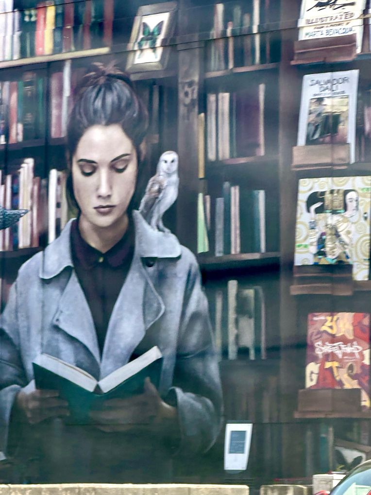 Je suis fan de Mantra depuis longtemps, mais cette fois-ci, point de papillons comme il en peint souvent, un exemple en Suisse pour l'Exomusée du Locle .... mais si vous regardez avec attention, vous verrez qu'il s'en cache tout de même deux petits, encadrés, dans cette immense bibliothèque ... on y voit aussi une chouette, posée sur l'épaule de la lectrice ... et des raies manta ... l'imagination de la jeune femme voyage grâce à la lecture. Il paraît que l'artiste de Metz s'est inspiré d'une photo de Marta Bevacqua (qui vit à Paris), et que le modèle est le mannequin Juliet Tsearle.