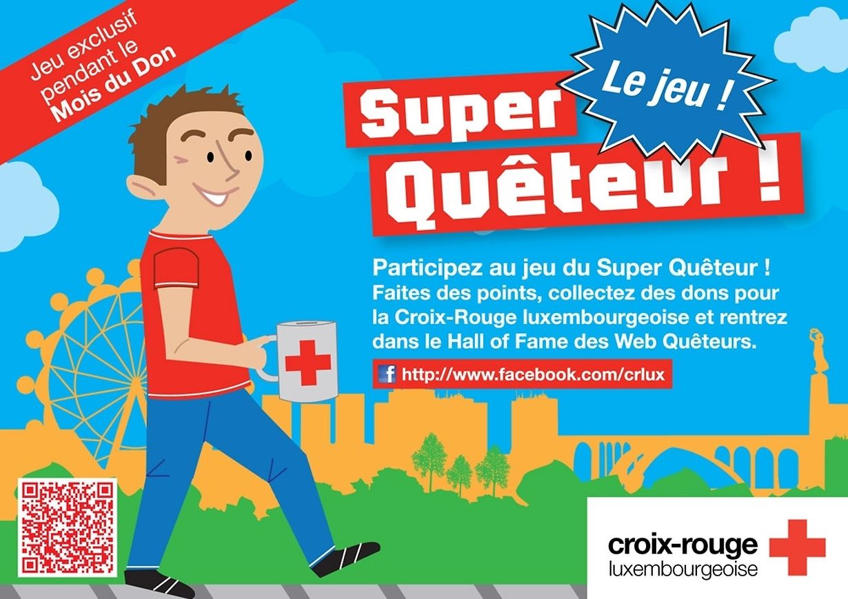 Chaque internaute disposant d’un compte Facebook peut rejoindre dès aujourd’hui la page de la Croix-Rouge pour jouer au jeu du Super Quêteur. Au fur et à mesure du jeu, les points engrangés seront transformés en euros par les sponsors du projet, que sont Foyer Assurances, Banque Raiffeisen et P&T LUXGSM, et grâce aux partenaires média, que sont Imprimerie Centrale, boomerang media, GES, L’Essentiel et ZAP.lu, ainsi que grâce au réalisateur du jeu, la société Mesh. Même si l’internaute est encouragé également à faire un don, c’est par son action de jeu qu’il collectera des dons pour la Croix-Rouge. Cette forme de partenariat entreprise et d’implication de la population par le jeu, une première l’année dernière, a connu beaucoup de succès. L’opération a donc été reconduite cette année.