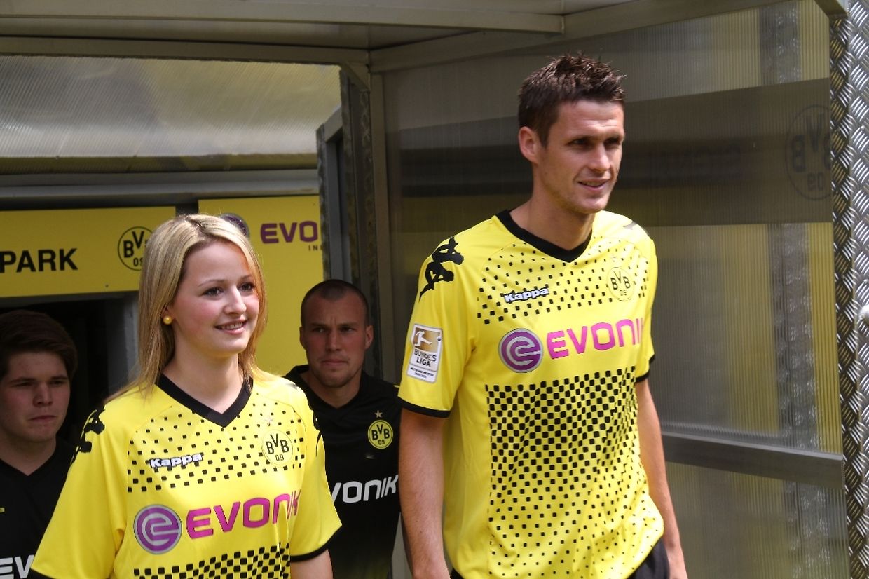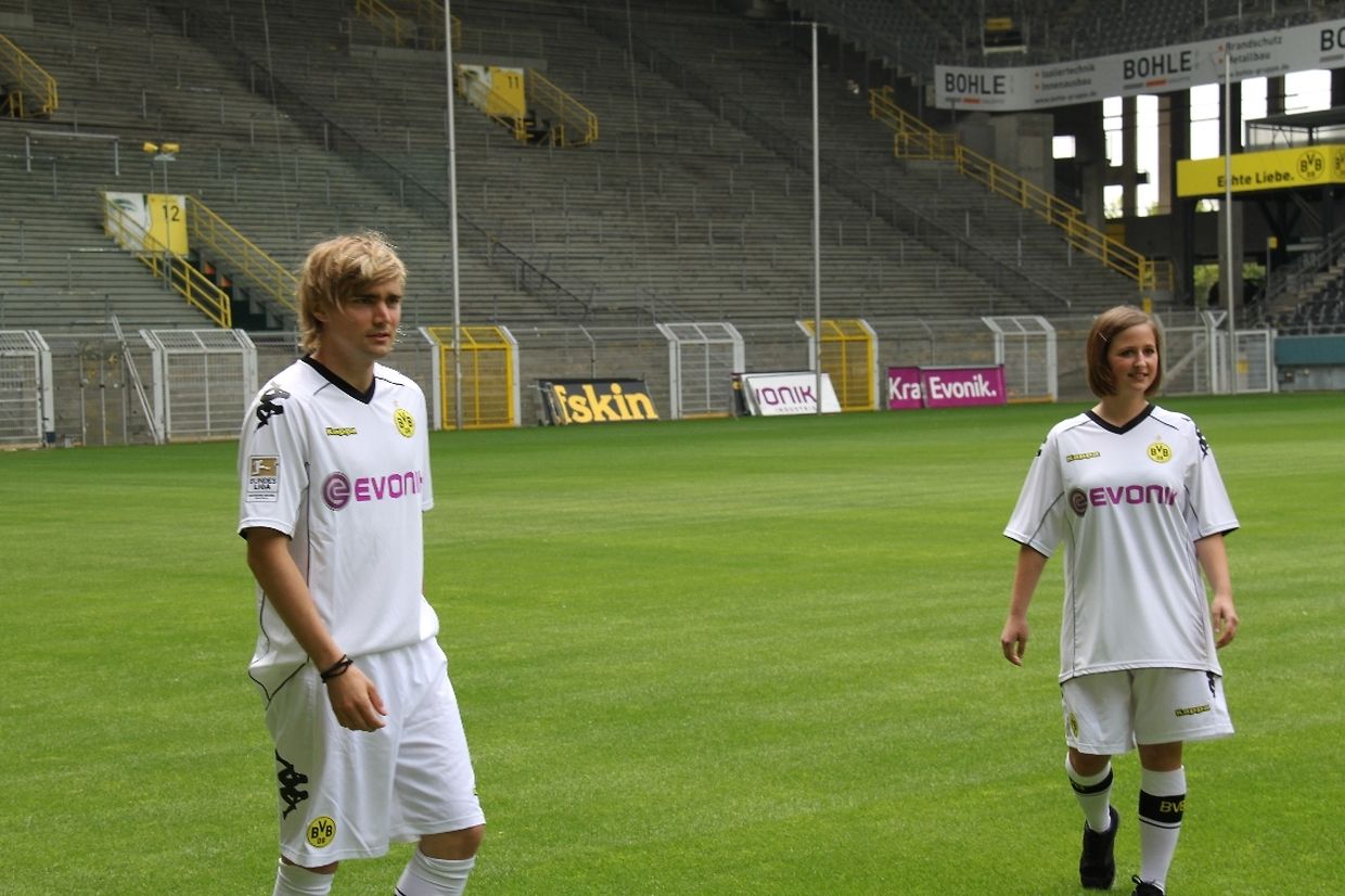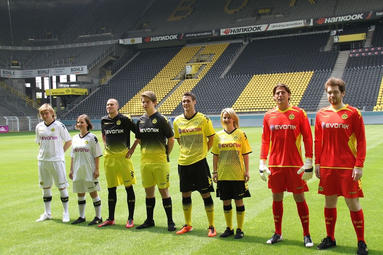 Auch in der Spielzeit 2011/2012 wird der BVB in den traditionellen Vereinsfarben auflaufen. Das neue Heimtrikot das Sally zusammen mit Kapitän Sebastian Kehl zeigte , präsentiert sich erneut im strahlenden Farbton "blazing yellow" und wird auf der Vorderseite durch graphische Prints in schwarz ergänzt. Sheila zeigte zusammen mit Marcel Schmelzer das komplett in weiss gehaltene Eventtrikot.