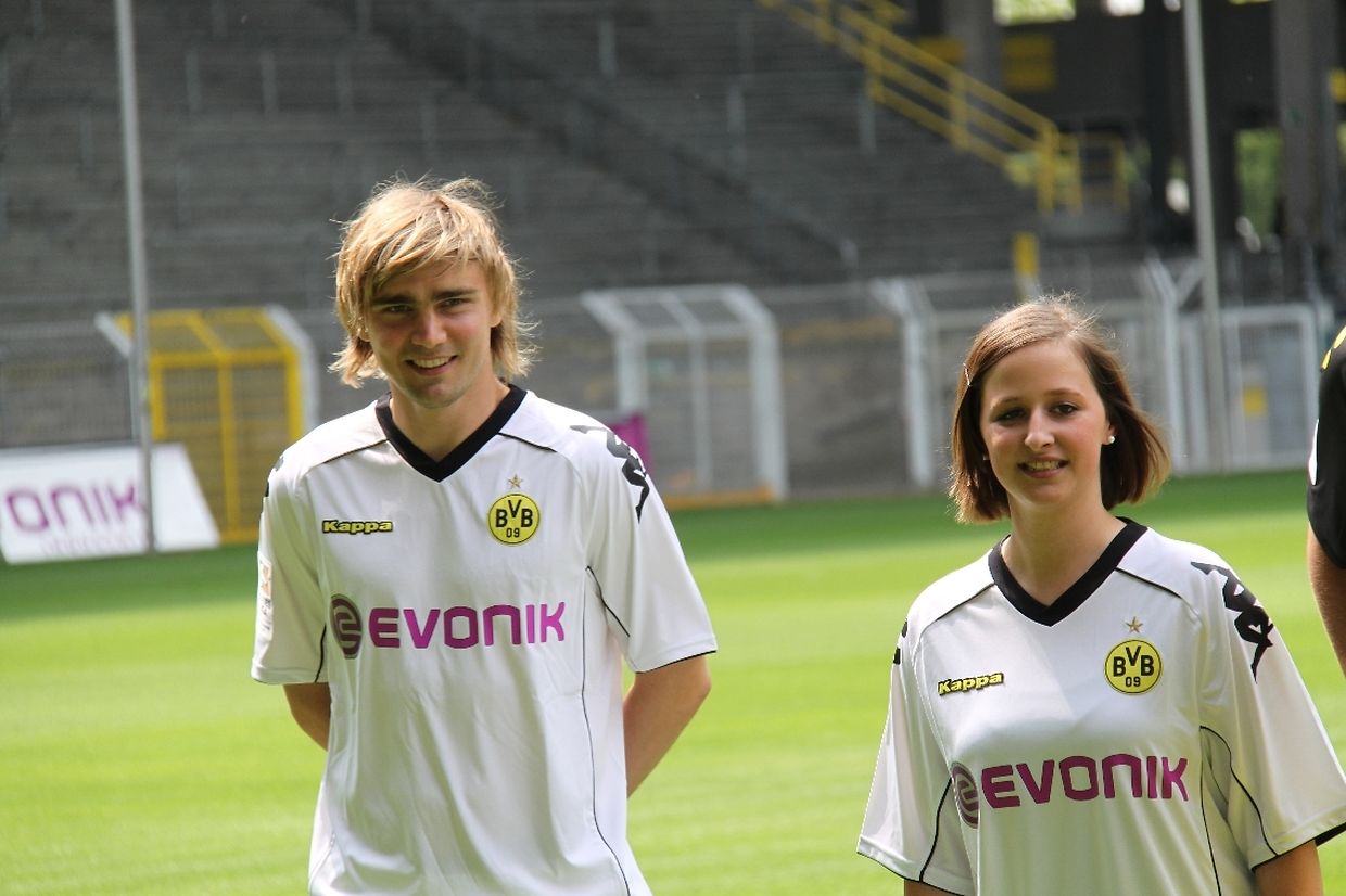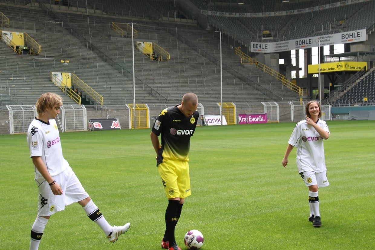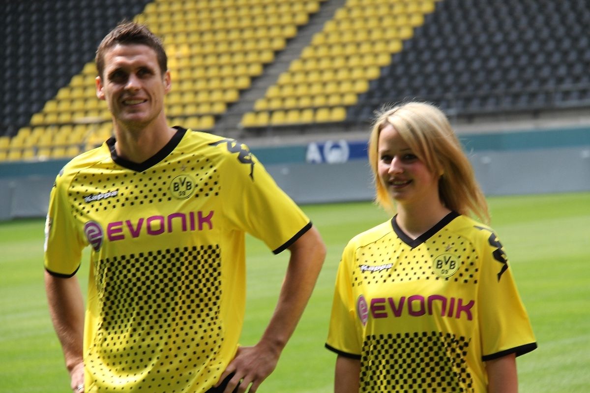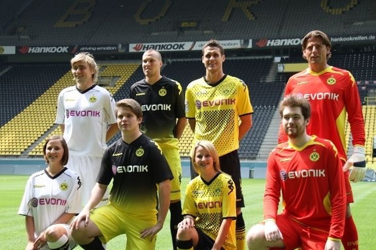 Auch in der Spielzeit 2011/2012 wird der BVB in den traditionellen Vereinsfarben auflaufen. Das neue Heimtrikot das Sally zusammen mit Kapitän Sebastian Kehl zeigte , präsentiert sich erneut im strahlenden Farbton "blazing yellow" und wird auf der Vorderseite durch graphische Prints in schwarz ergänzt. Sheila zeigte zusammen mit Marcel Schmelzer das komplett in weiss gehaltene Eventtrikot.