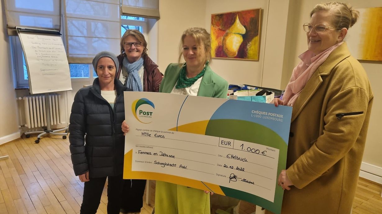Fir d’Joer ofzeschleissen waren e puer Komitésmemberen vun der Schungkëscht asbl och nach bei den Femmes en détresse virstelleg gin. D’Présidentin vun de Fraenhaiser, d’Madame Andrée Birnbaum, konnt sech niewt engem Don iwwert 1000 € och nach iwwert Spillsaachen an Fraen/Kannerkleeder fir di kleng an di mi grouss Bewunner vun hiren Institutiounen freeën. No dëser Aktion sin d’Memberen vun der karitativer Organisatioun dann och an hier wuelverdingten Krëschtvakanz gangen.