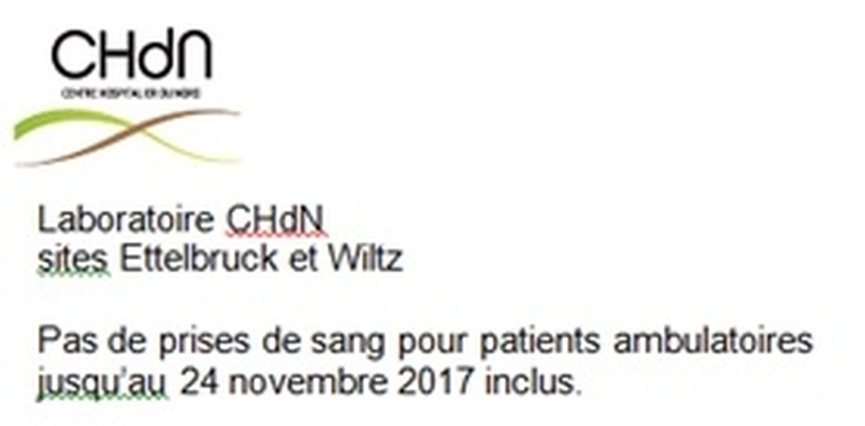 Ettelbruck Laboratoire CHdN sites Ettelbruck et Wiltz Centre Hospitalier Du Nord Chdn Publié le mercredi 15 novembre 2017 à 08:06 Ettelbrück, Luxemburg Laboratoire CHdN sites Ettelbruck et Wiltz Pas de prises de sang pour patients ambulatoires jusqu’au 24 novembre 2017 inclus. Signaler contenu inapproprié Plus de nouvelles de Centre Hospitalier Du Nord Chdn > Feierliche Ehrung im CHdN - Mitarbeiter wurden in den Ruhestand verabschiedet 07/03/23 Ettelbruck CHdN ehrt langjährige Mitarbeiter 08/12/22 Ettelbruck CHdN Mitarbeiter in den Ruhestand verabschiedet 12/05/22 Ettelbruck CHdN ehrt langjährige Mitarbeiter 05/02/20 Ettelbruck Abschiedsfeier vom Berufsleben im Centre Hospitalier du Nord 27/11/19 Ettelbruck