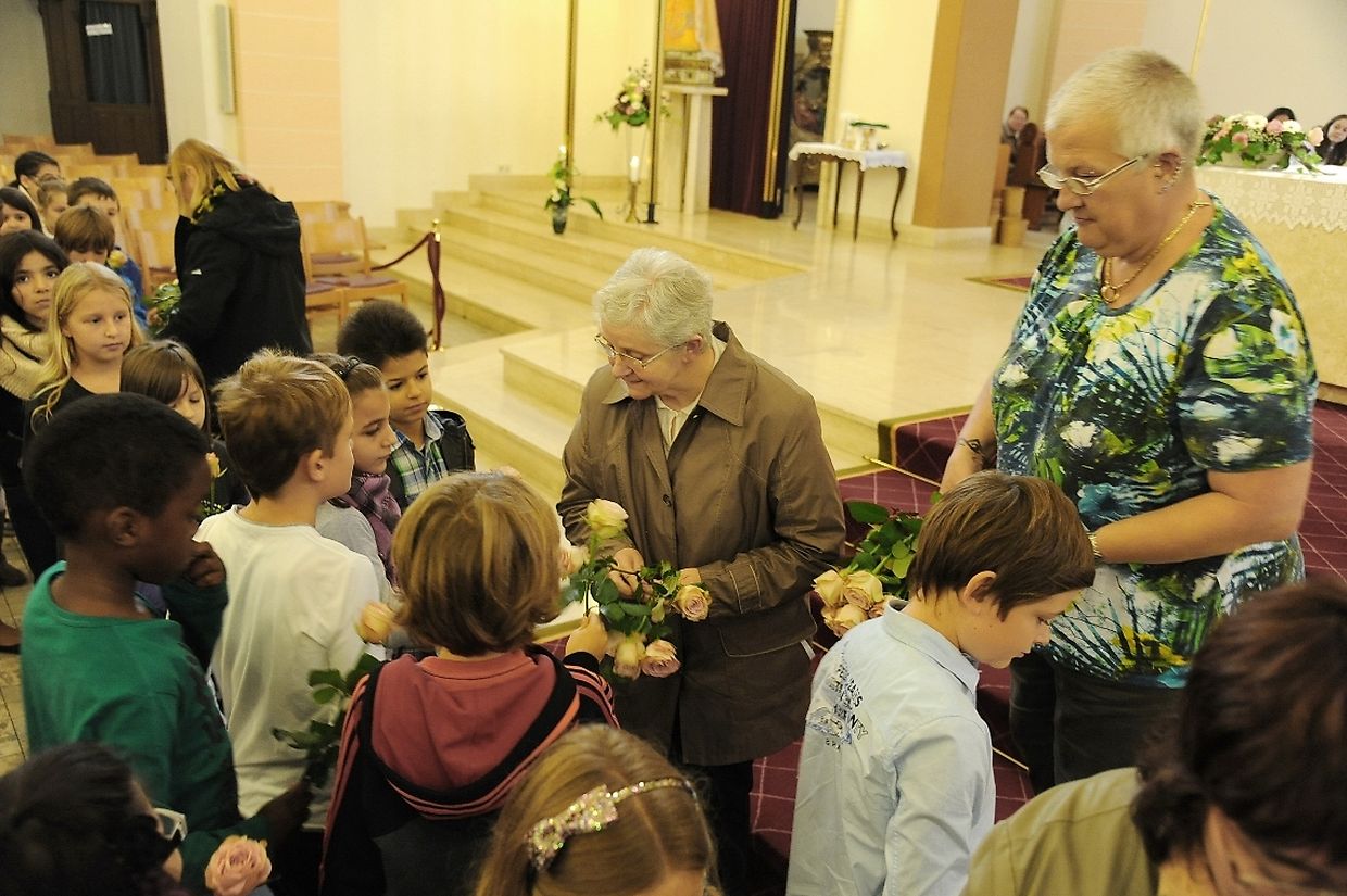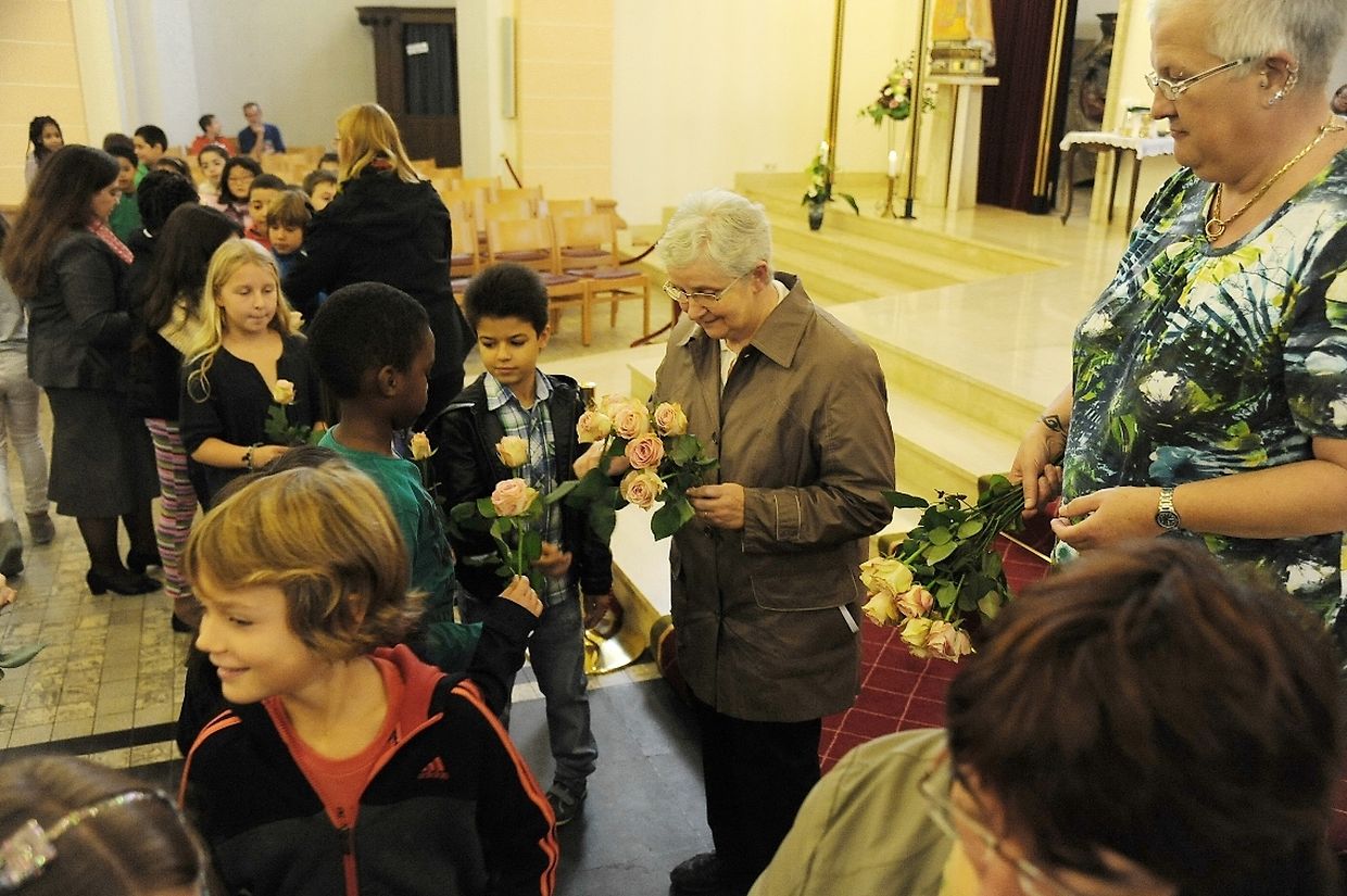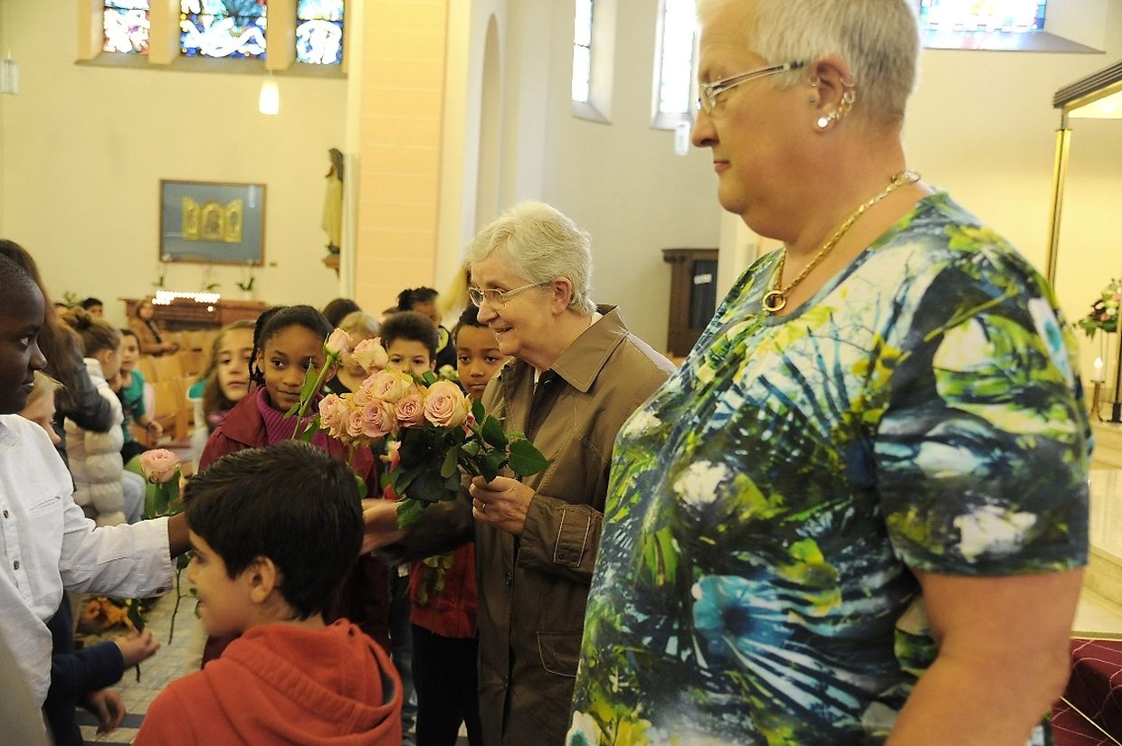 Schwester Virginie Schlesser wurde unter dem Namen Margot im Dezember 1943 in Ettelbrück geboren. Ihre „Prise d’Habit“ als Schwester der „Doctrine Chrétienne“ war 1965 in Ettelbrück. Ihre berufliche Laufbahn begann sie im Jahre 1966 als Haushaltungslehrerin im Komplementarunterricht in Wiltz bis 1981 um dann in Schrassig im Erziehungsheim zu arbeiten. Vor allem war Schwester Virginie aber auch in der Landjugend bis 1989 in Heinerscheid aktiv und arbeitete des weiteren eine Zeit in Afrika, an der Côte d’Ivoire. Nach ihrer Rückkehr 1990 übernahm sie das Amt der Pfarrassistentin in der Pfarrei Ettelbruck und engagierte sich dort mit vollem Leib und Seele, zuerst mit Pfarrer Robert Quintus, von 1992 bis 2008 mit Pfarrer Jos Sauber, danach mit Pfarrer Maurice Péporté und Daniel Graul. Des Weiteren war Schwester Virginie als Religionslehrerin tätig und war auch die treibende Kraft bei den Kommunions- und Firmungs- Vorbereitungen , bei den Kindermessen, im Pfarrrat sowie im Pfarrverbandsrat. An den „ Oeuvres Paroissiales“ , der Vinzenzkonferenz und bei den Frauen und Müttern war sie stets im Einsatz und rief ebenso eine“ Blumenéquipe“ ins Leben. Abschließend wünschte Sylvie Bisdorff der scheidenden Schwester Virginie einen erholsamem Ruhestand, mit großem Dank für all die unzähligen Dienste, die sie in all den Jahren in der Pfarrgemeinschaft mit Gottes Hilfe geleistet habe, in der Hoffnung, dass sie auch weiterhin als freiwillige Helferin der Pfarrei erhalten bleibe. In seiner Predigt würdigte Pfarrer Maurice Péporté die wertvolle Arbeit beider Schwestern, die in den 29 resp. 23 Jahren, aus dem Glauben heraus, viele kleine, konkrete Schritte, aus Liebe zu Gott und zu den Menschen gemacht haben. Im Namen der Messdiener bedankte sich Liliane Braun für den Einsatz der beiden Schwestern, mit einem passenden selbstverfassten Gedicht und überreichte ein „Chèque Cadeau“ von den Ettelbrücker Messdienern. Die Schul- und Erstkommunionkinder überreichten einen prachtvollen Rosenstrauss.