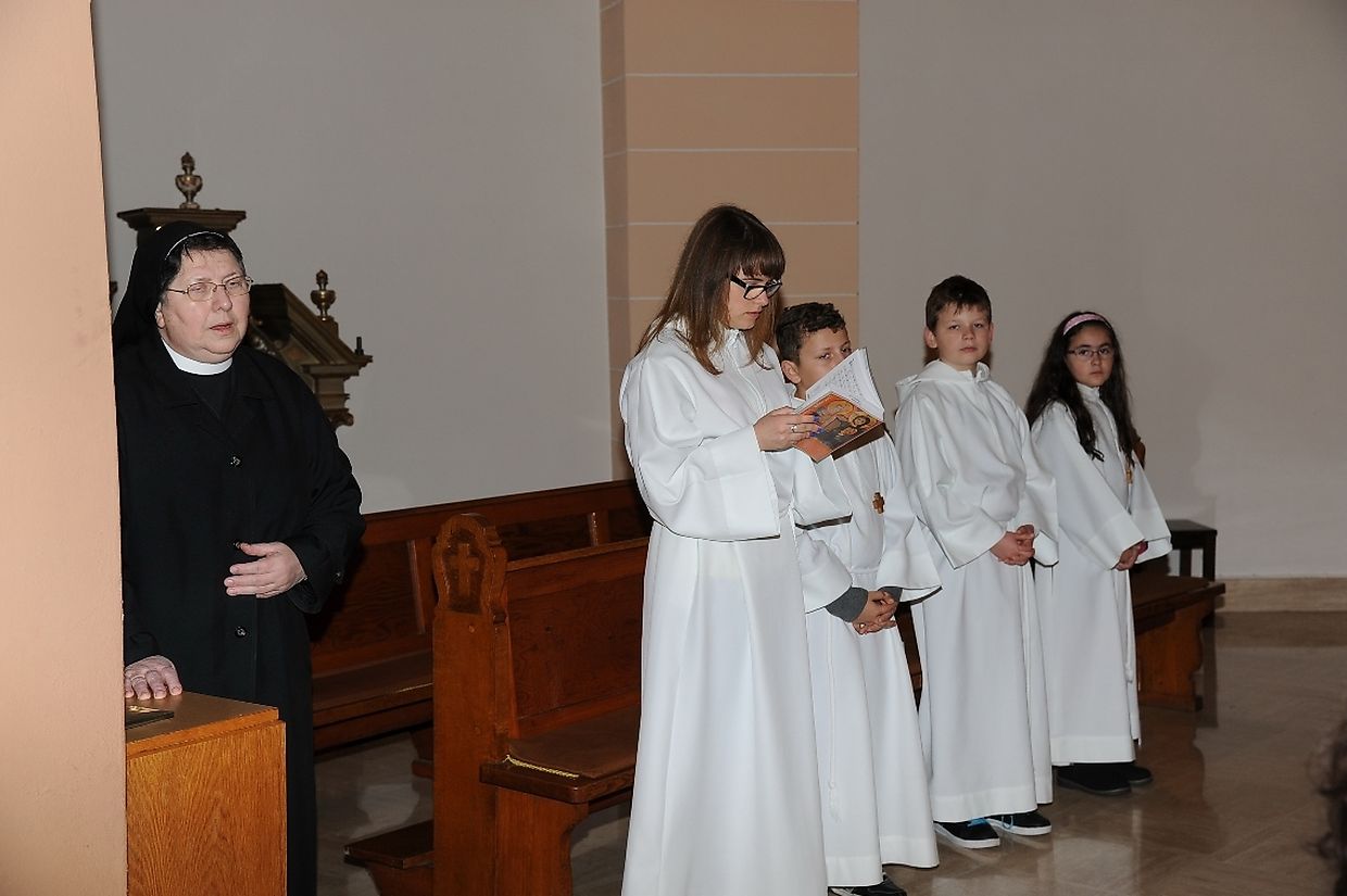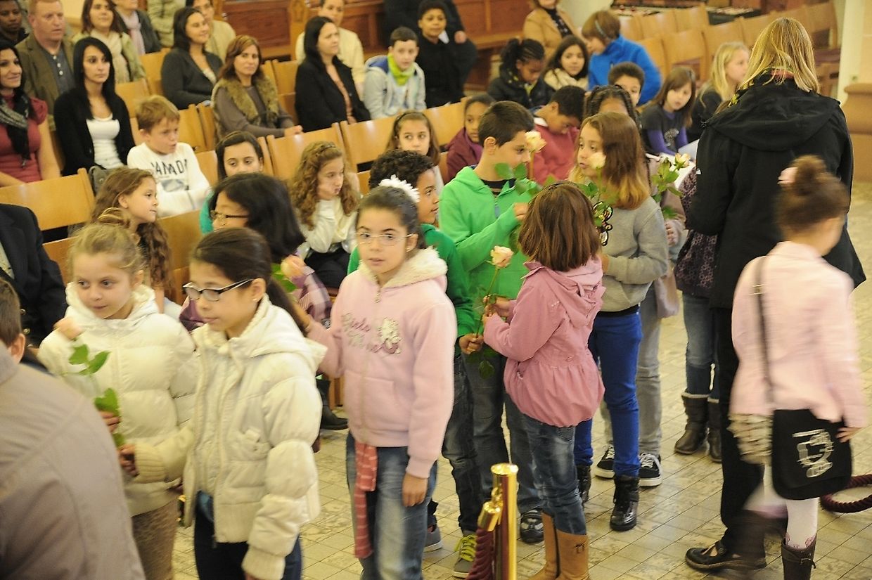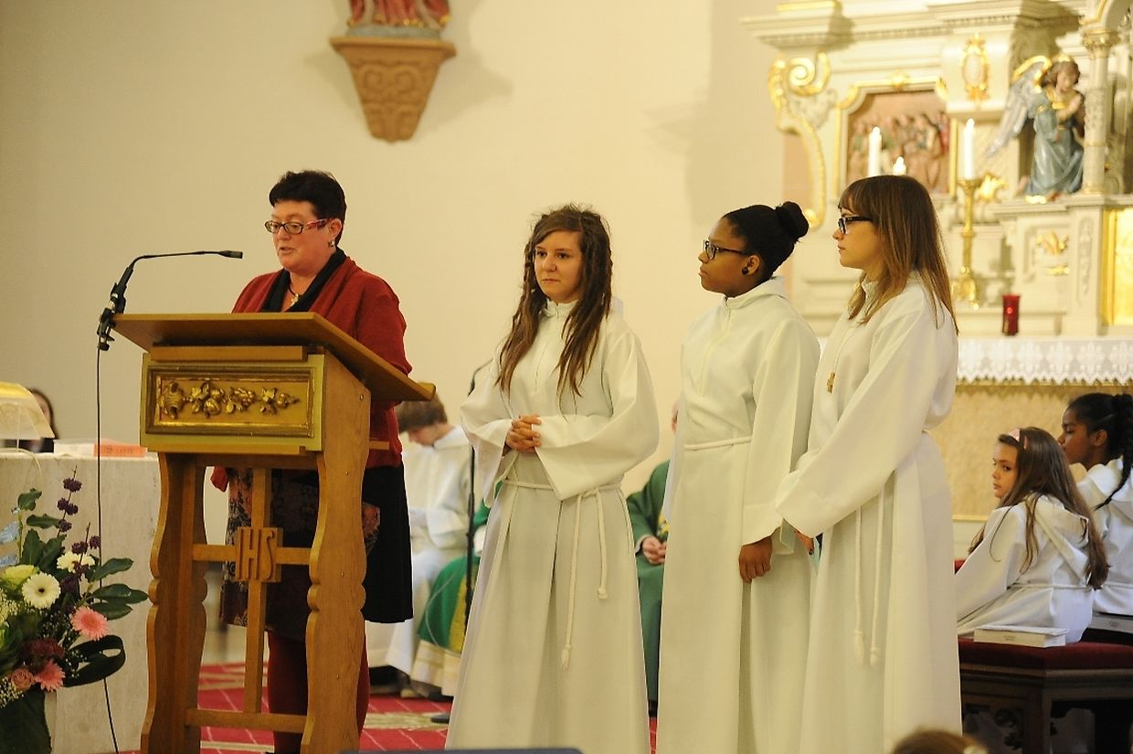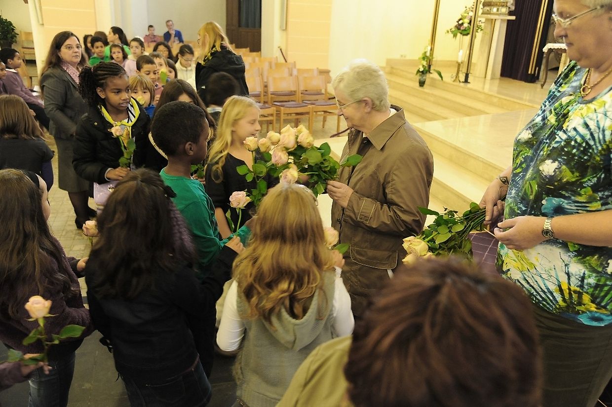 Schwester Virginie Schlesser wurde unter dem Namen Margot im Dezember 1943 in Ettelbrück geboren. Ihre „Prise d’Habit“ als Schwester der „Doctrine Chrétienne“ war 1965 in Ettelbrück. Ihre berufliche Laufbahn begann sie im Jahre 1966 als Haushaltungslehrerin im Komplementarunterricht in Wiltz bis 1981 um dann in Schrassig im Erziehungsheim zu arbeiten. Vor allem war Schwester Virginie aber auch in der Landjugend bis 1989 in Heinerscheid aktiv und arbeitete des weiteren eine Zeit in Afrika, an der Côte d’Ivoire. Nach ihrer Rückkehr 1990 übernahm sie das Amt der Pfarrassistentin in der Pfarrei Ettelbruck und engagierte sich dort mit vollem Leib und Seele, zuerst mit Pfarrer Robert Quintus, von 1992 bis 2008 mit Pfarrer Jos Sauber, danach mit Pfarrer Maurice Péporté und Daniel Graul. Des Weiteren war Schwester Virginie als Religionslehrerin tätig und war auch die treibende Kraft bei den Kommunions- und Firmungs- Vorbereitungen , bei den Kindermessen, im Pfarrrat sowie im Pfarrverbandsrat. An den „ Oeuvres Paroissiales“ , der Vinzenzkonferenz und bei den Frauen und Müttern war sie stets im Einsatz und rief ebenso eine“ Blumenéquipe“ ins Leben. Abschließend wünschte Sylvie Bisdorff der scheidenden Schwester Virginie einen erholsamem Ruhestand, mit großem Dank für all die unzähligen Dienste, die sie in all den Jahren in der Pfarrgemeinschaft mit Gottes Hilfe geleistet habe, in der Hoffnung, dass sie auch weiterhin als freiwillige Helferin der Pfarrei erhalten bleibe. In seiner Predigt würdigte Pfarrer Maurice Péporté die wertvolle Arbeit beider Schwestern, die in den 29 resp. 23 Jahren, aus dem Glauben heraus, viele kleine, konkrete Schritte, aus Liebe zu Gott und zu den Menschen gemacht haben. Im Namen der Messdiener bedankte sich Liliane Braun für den Einsatz der beiden Schwestern, mit einem passenden selbstverfassten Gedicht und überreichte ein „Chèque Cadeau“ von den Ettelbrücker Messdienern. Die Schul- und Erstkommunionkinder überreichten einen prachtvollen Rosenstrauss.