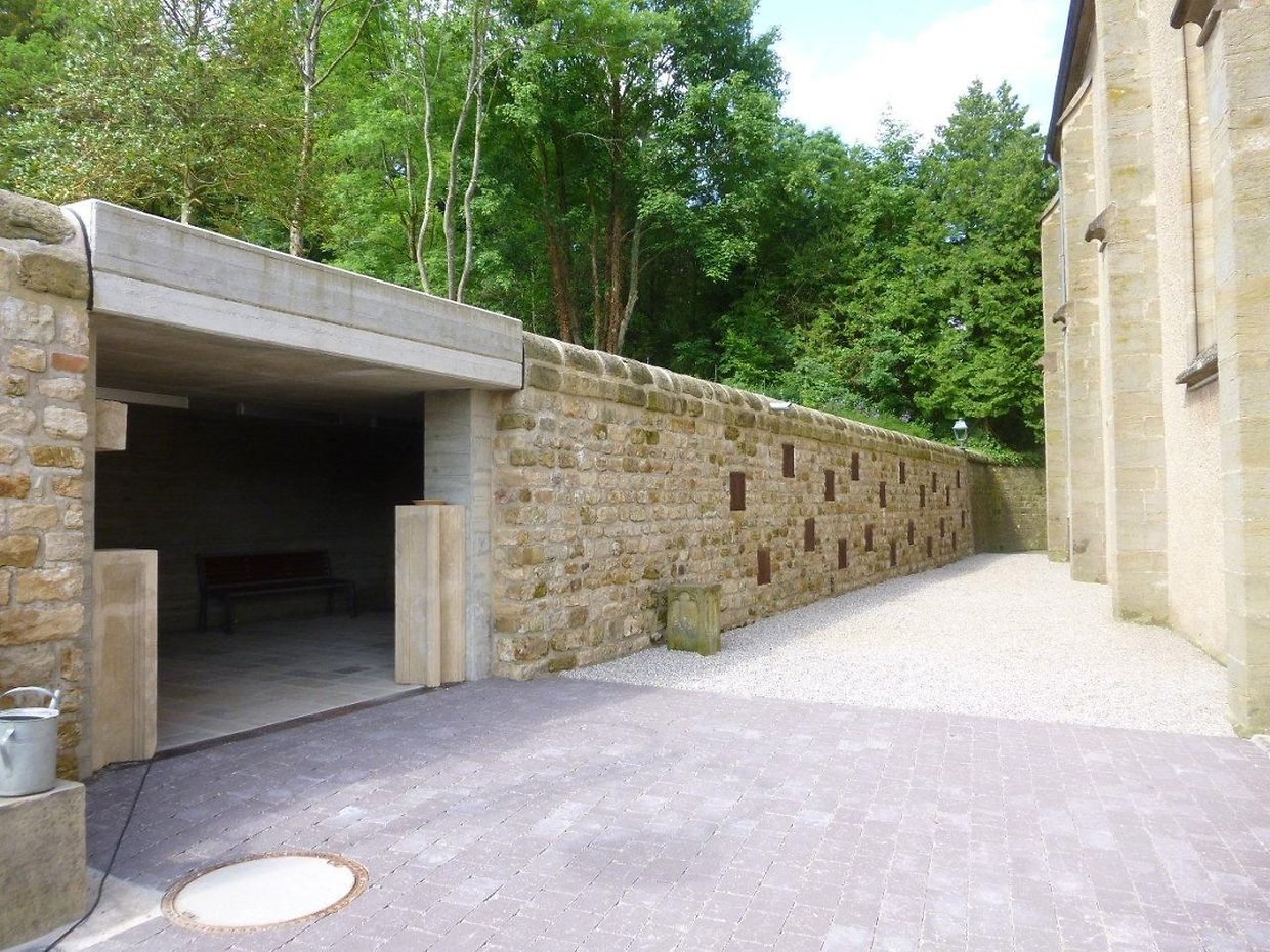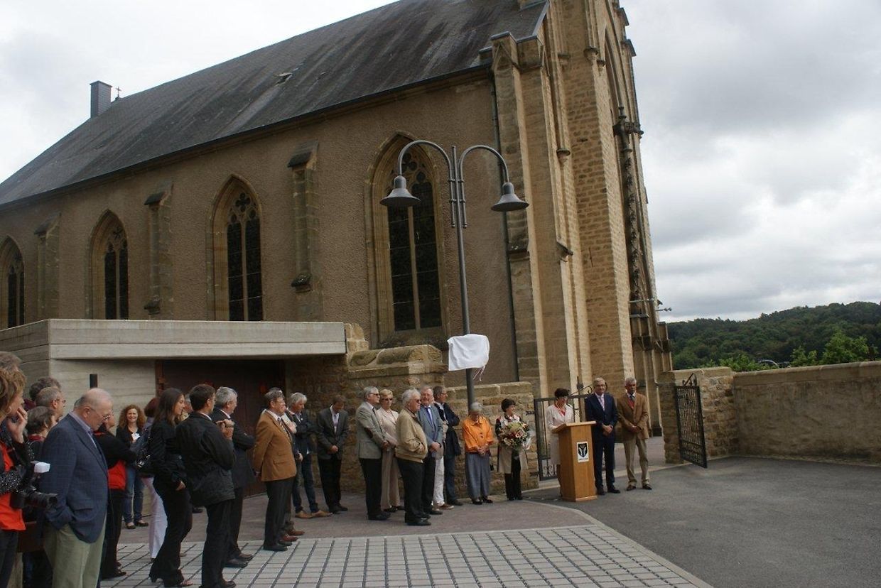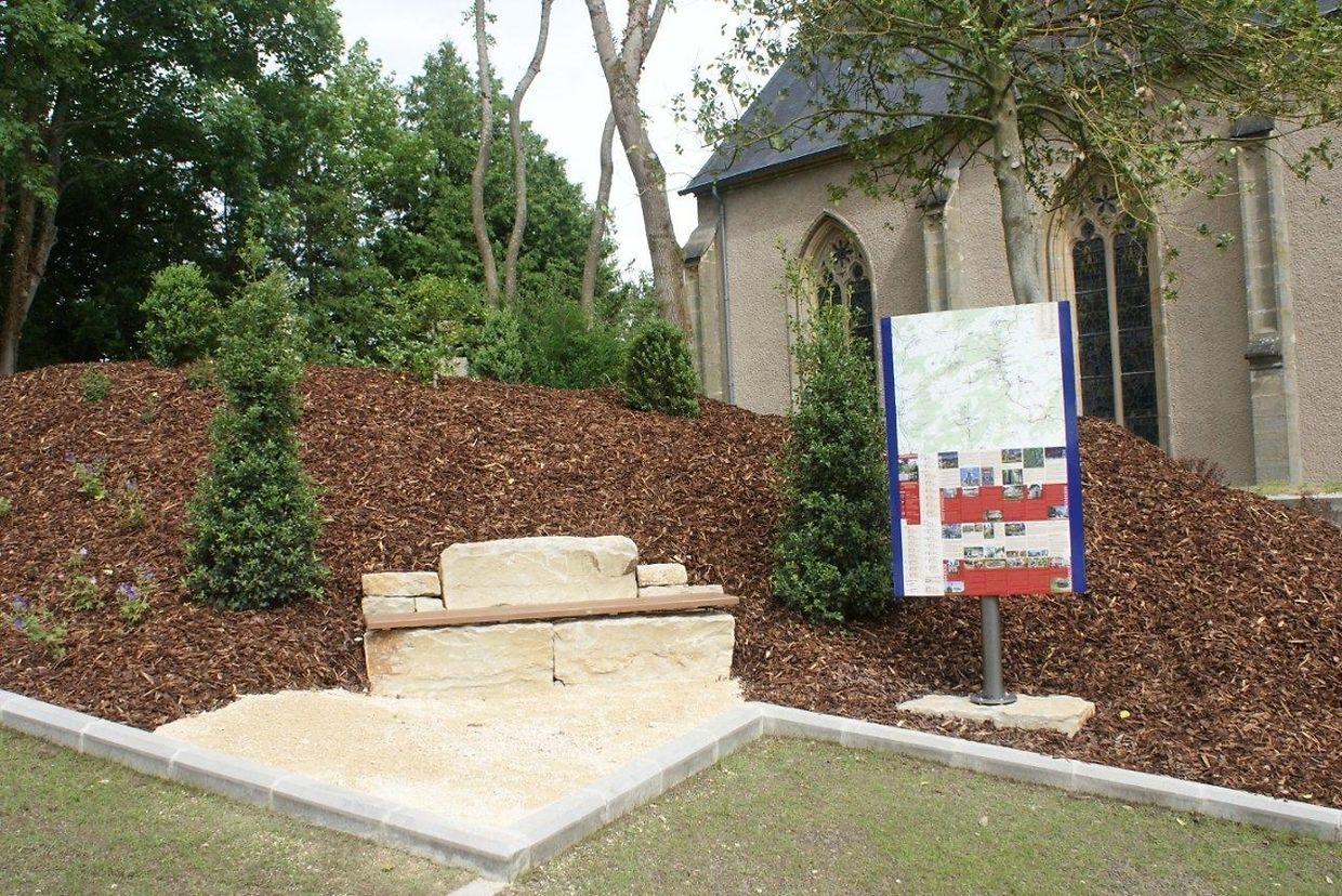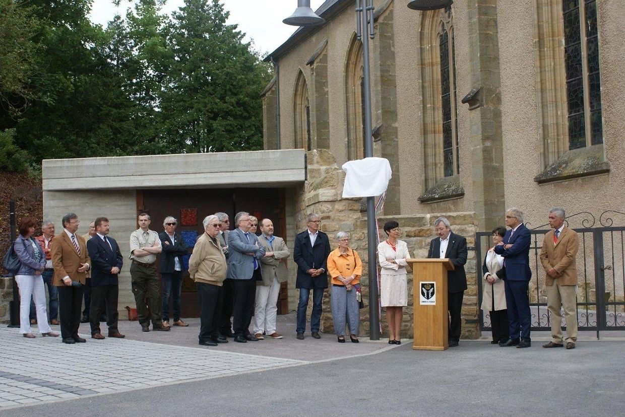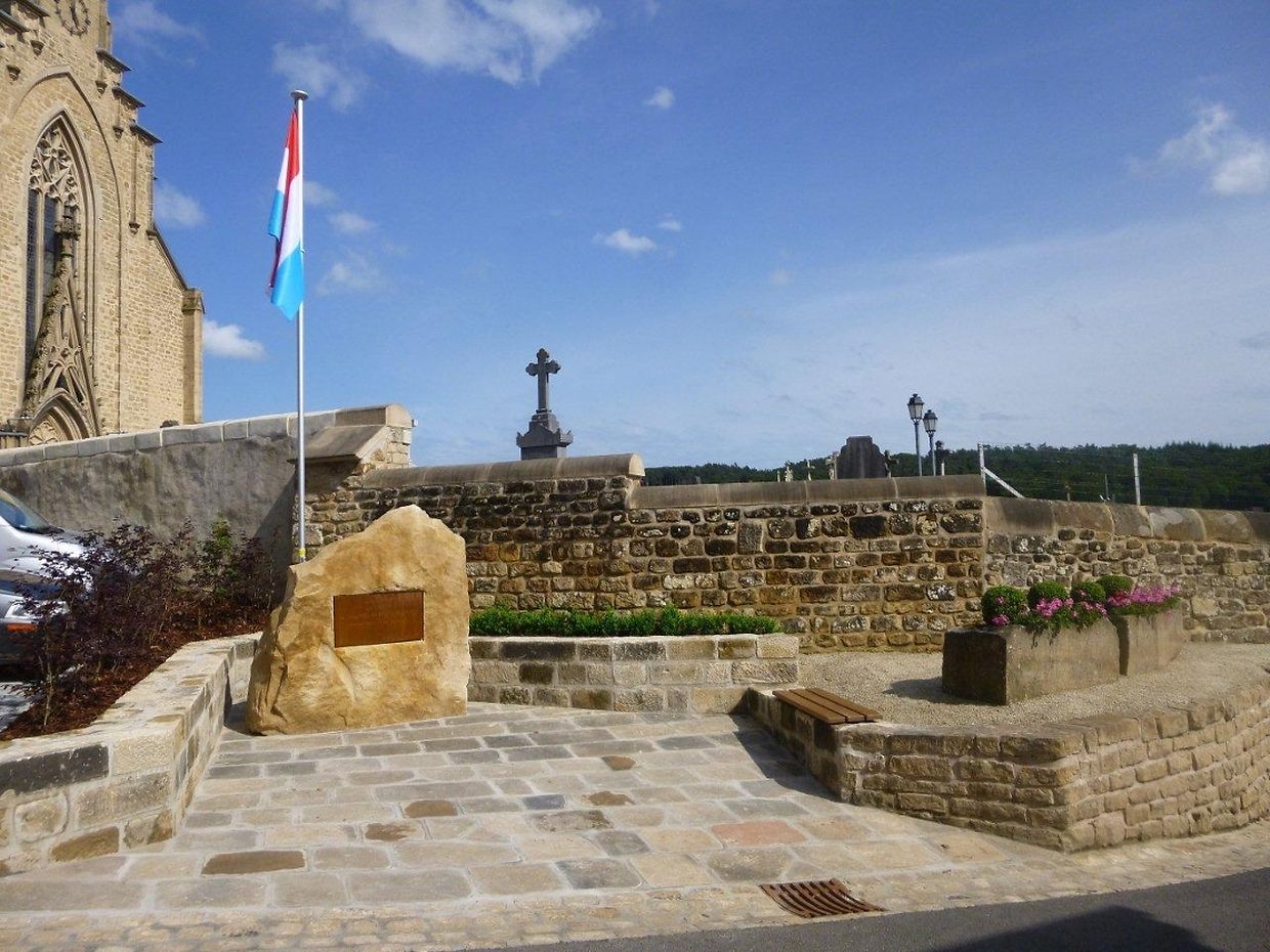 Bis zur letzten Minute wurde gearbeitet und alles auf Hochglanz gebracht. In Fischbach wurde neben der Kirche ein neuer ökologischer Parkplatz, sowie ein Unterstand für die Trauernden bei Begräbnissen mit anschließendem Kolumbarium in der Kirchhofsmauer eingeweiht. Unsere Gemeinde hat nun auch endlich ein Monument um den Opfer der beiden Weltkriege zu gedenken. Durch die Arbeiten rund um die Kirche ist auch hervorzuheben dass der Eingang zur Fischbacher Kirche nun behindertengerecht ist. Auch zwei neue Wanderwege führen die Besucher ab heute vom Platz "Mill Majerus" aus in die schöne Natur rund um Fischbach. Viele Elemente sind aus Stahl, um an die vergangenen Hochöfen in Fischbach zu erinneren.