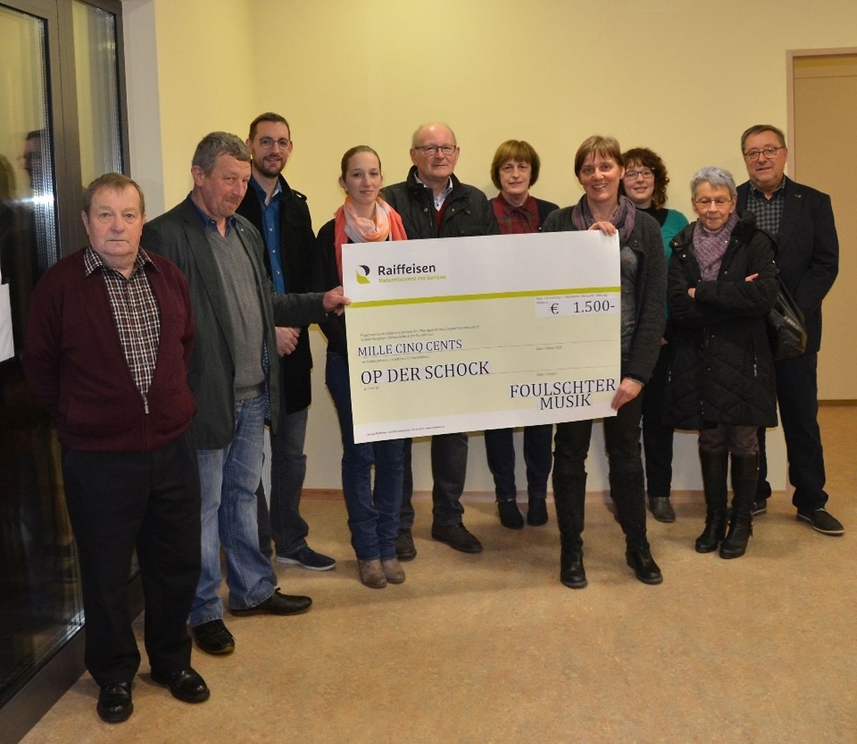 Als im vergangenen September der Dirigent der „Foulschter Musik“, Herr Tim Kleren, sein Masterexamen ablegte, und deswegen die Militärmusik in Folscheid weilte, war es mit dem Wunsch verbunden, das Ganze als Benefizkonzert zu Gunsten der Vereinigung „Op der Schock „ aus Redingen zu organisieren. Die gemeinsame Solidaritätsaktion hat die Summe von 1.500 € eingespielt. Kürzlich konnten die Verantwortlichen den Betrag an die Direktorin Frau Nicole Fisch im Beisein von den Verwaltungsratsmitglieder, Frau Fox-Wantz und Herr Wagener Fränz „Op der Schock“ überreichen. Die Vereinigung “Op der Schock“ zeigte sich über den Erlös des Konzerts erfreut, und dankte den Spendern für die finanzielle Unterstützung. Das Geld wird in die Wohnstruktur für Menschen mit einer geistigen Behinderung in Mertzig investiert. Informationen unter : http://www.ods.lu/index.html