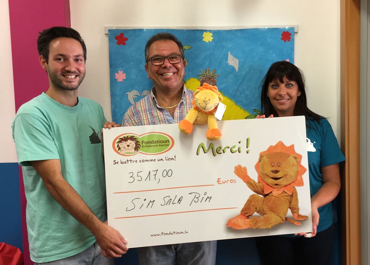 A l’occasion de l’anniversaire des 10 ans de la Crèche Sim Sala Bim à Frisange, une fête hawaïenne a été organisée en faveur de la Fondatioun Kriibskrank Kanner. Grâce à l’engagement des éducateurs et éducatrices de la crèche, ainsi qu’à la présence des parents et enfants à la fête, un chèque de 3517 EUR a été remis à Monsieur Romain Henrion, représentant la Fondatioun. Au nom de toute l’équipe de la Fondatioun, un très grand merci. www.fondatioun.lu