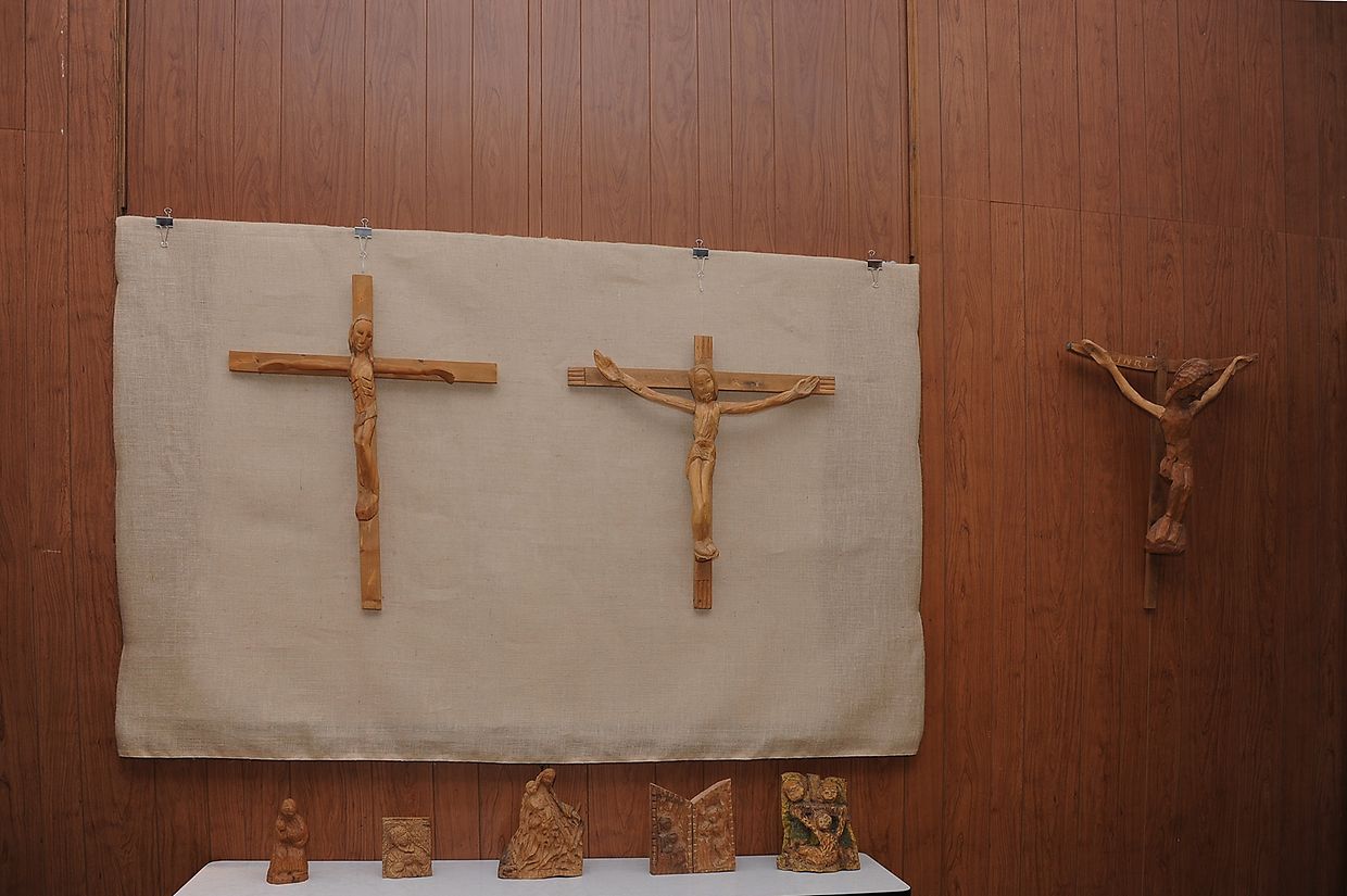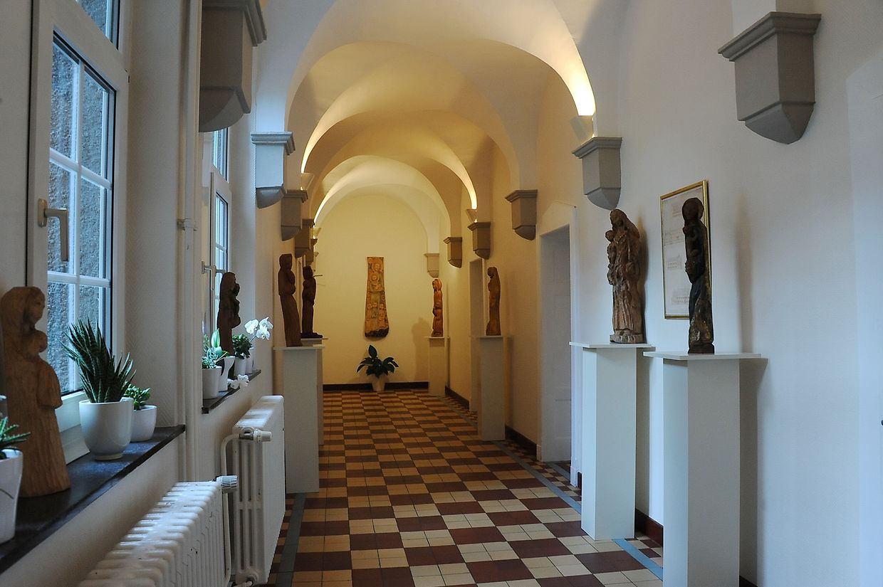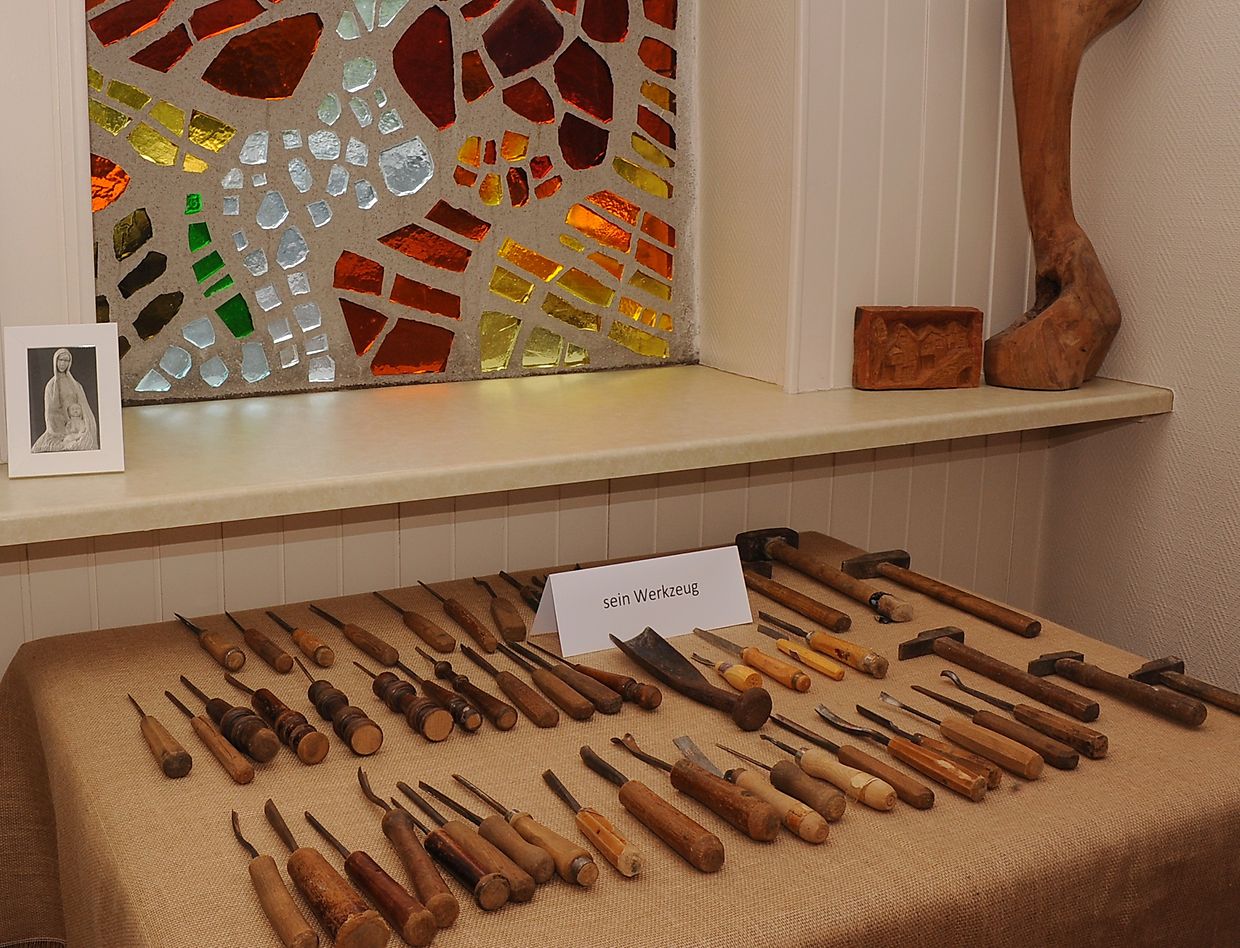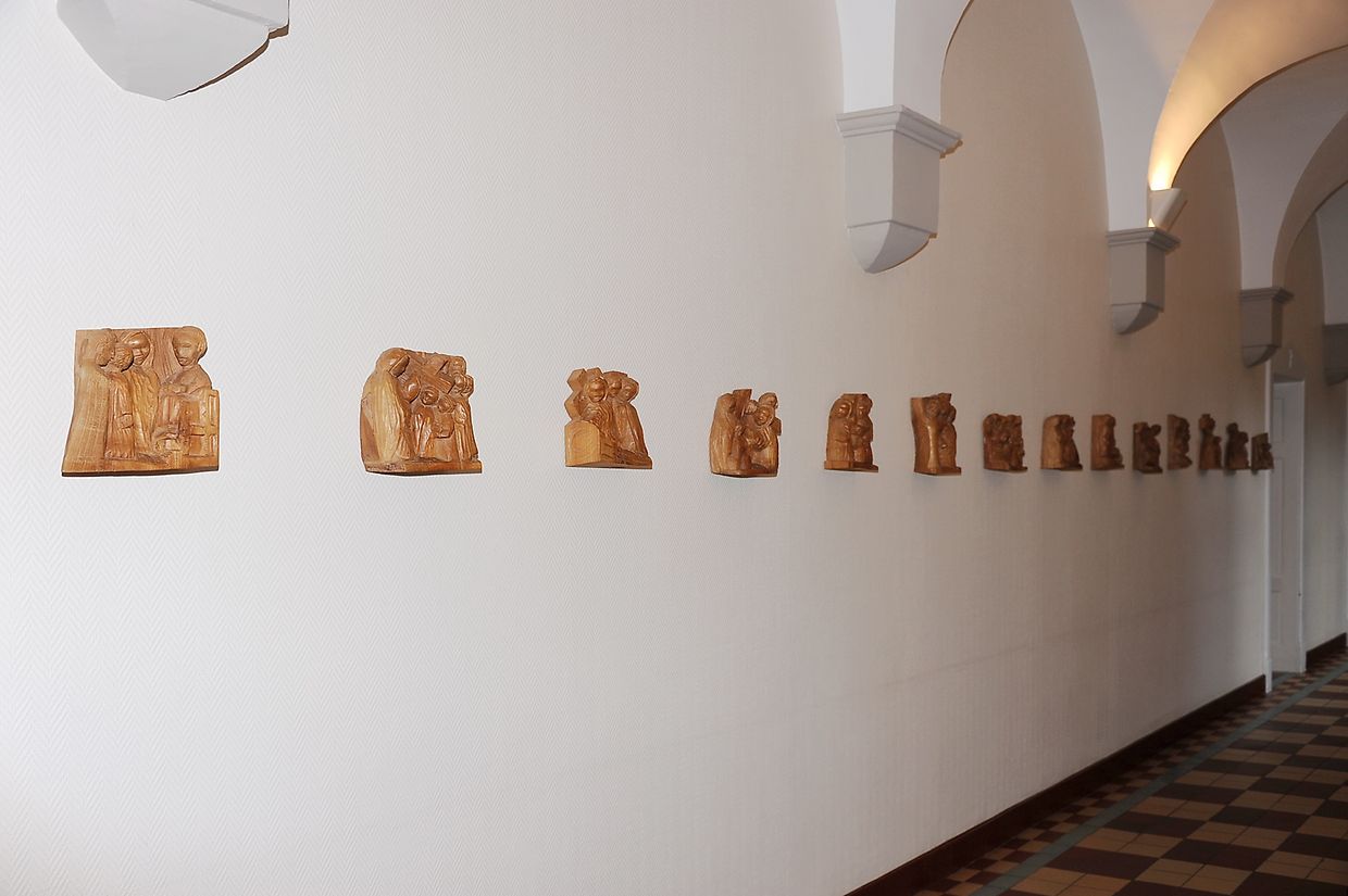 An der Ausstellung am Klouschter zu Fünfbrunnen kann een eng Rei Wierker aus Holz betruechten, déi vum Pater Marcel Denis (1908-1978) geschaaft goufen. De Kënschtler huet aus dem réiem Stéck Holz, dat d'Form an senger Orginalitéit virginn huet, mat sengem Stil, den och den Ausdrock vum Glawe weist, a säin Wierk geschnëtzt.