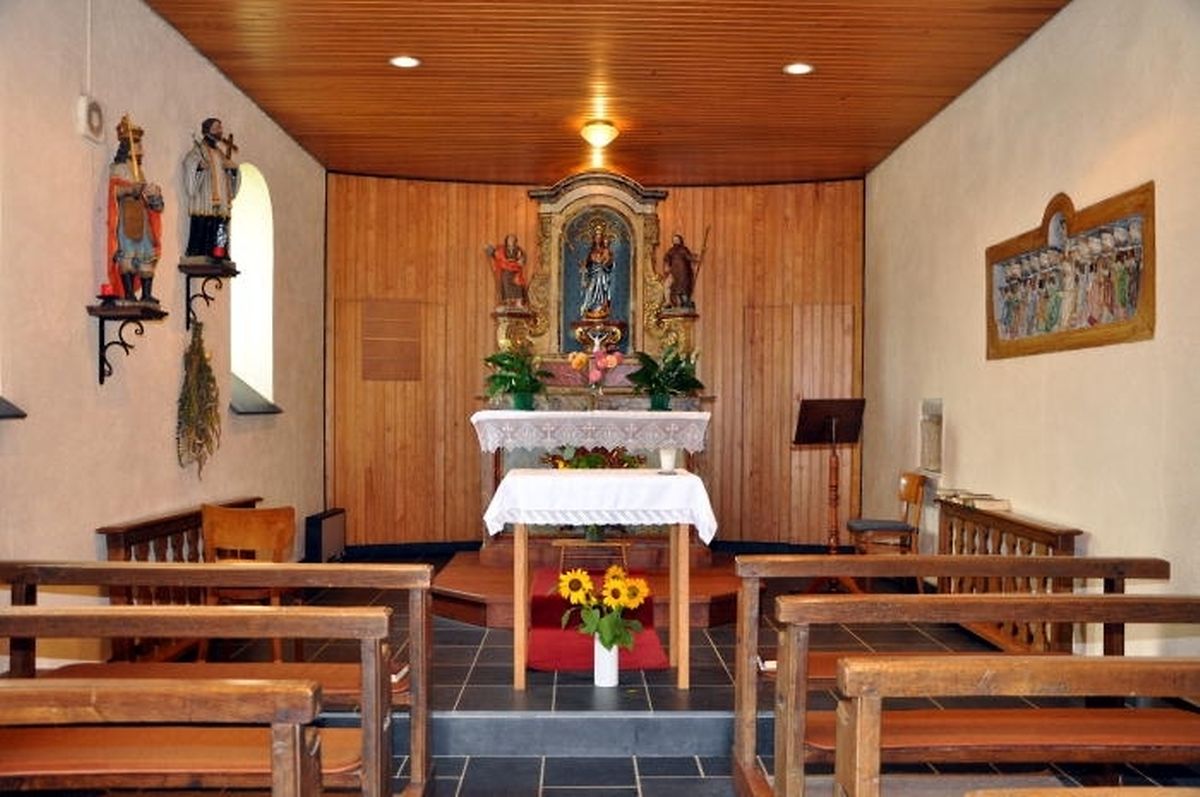 Das Relief, das fest in der Wand eingelassen ist, hat ohne Zweifel Seltenheitswert. Die Apostel stehen zu je sechs auf beiden Seiten der Heiligen Dreifaltigkeit. Das Symbol des Heiligen Geistes steht zwischen Gott-Vater und Gott-Sohn am Kreuz. Beeindruckend sind auch die Farben des Reliefs. Die Apostel tragen alle in ihrer linken Hand ein Evangelienbuch, in der rechten das Werkzeug des jeweils von ihnen erlittenen Martyriums. Jahrelang pflegte eine gewisse Lisy Hymes das kleine Gotteshaus, die für ihre Leistungen 1978 vom damaligen Bischof Jean Hengen ausgezeichnet wurde.