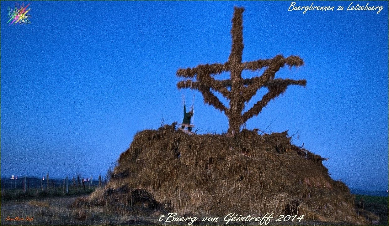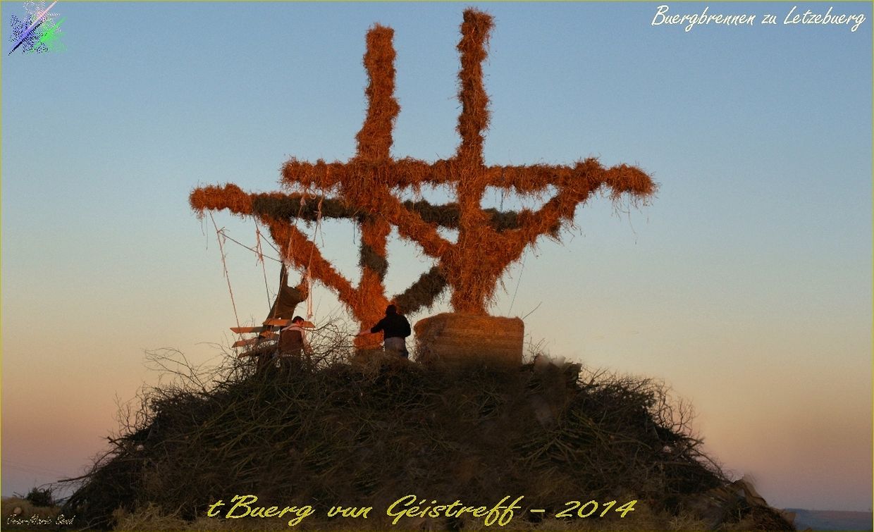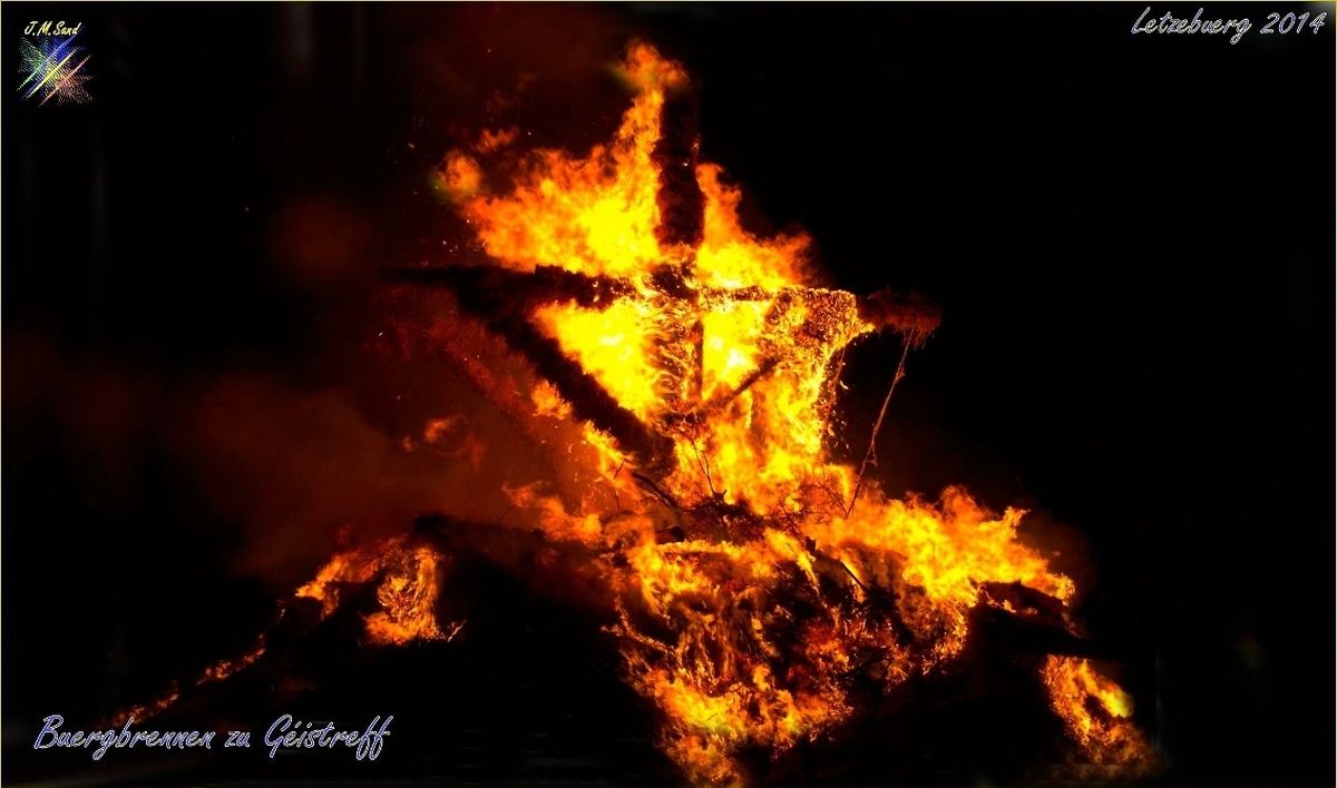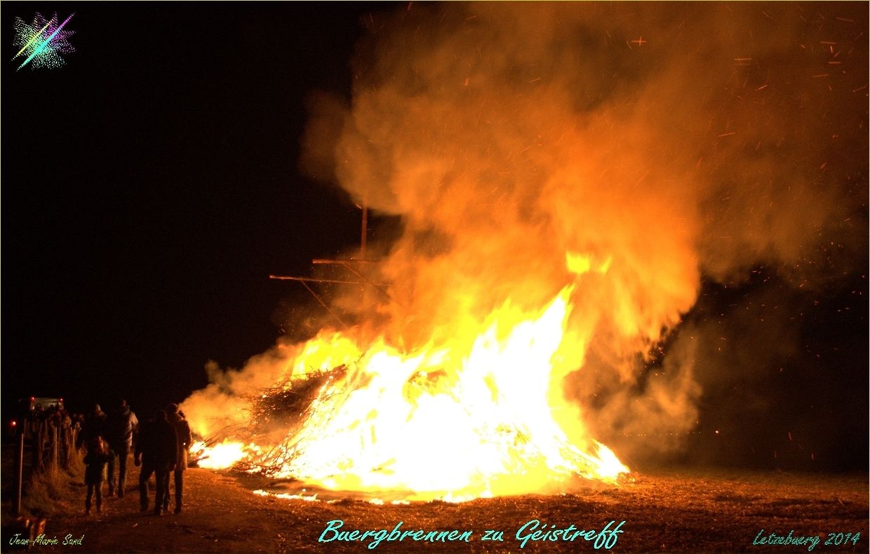 Wéi all Jo'er ass "zu Géistreff eng immens rieseg groùss an wonnerschéin Buerg" verbrannt gin - 2 Mega-Kréitzer vun iwert 20 Meter héich nièwendeneen!! Mee dest Joer war t'Buergbrennen bei richtegen Fréijohrs-Temperaturen schonns ewéi éent wirklecht Fréijohrs-Fest - ganz einfach flott an schéin :-)