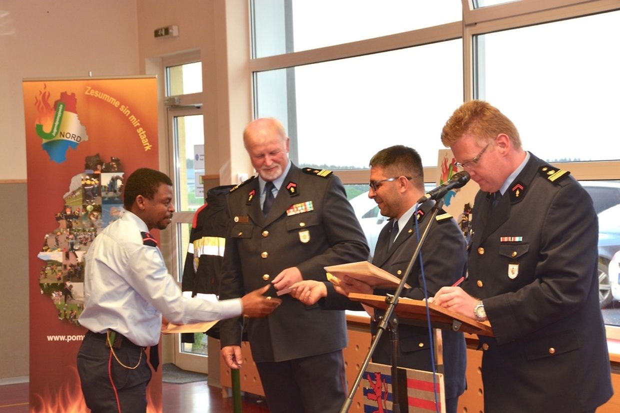 Zusammen mit Regionalinstruktor Fernando Ferreira und dem Regionaldelegierten Christian Schmitz wurden dann den anwesenden Feuerwehrleuten ihre Diplome unter grossem Applaus ausgehändigt. Hierbei wissenswert, 47 Feuerwehrleute bekamen die Urkunde für den Atemschutzgeräteträgerkurs; 41 Feuerwehrwehrleute schlossen den FGA1 ( Feuerwehrgrundausbildung ) ab, 10 Feuerwehrleute bekamen die Urkunde für den FGA2 Kurs, derweil noch 19 Feuerwehrleute die Urkunde für die Inititation – SAUVETAGE und 6 Feuerwehrleute für den Initiationskurs –AMBULANZ erhielten.