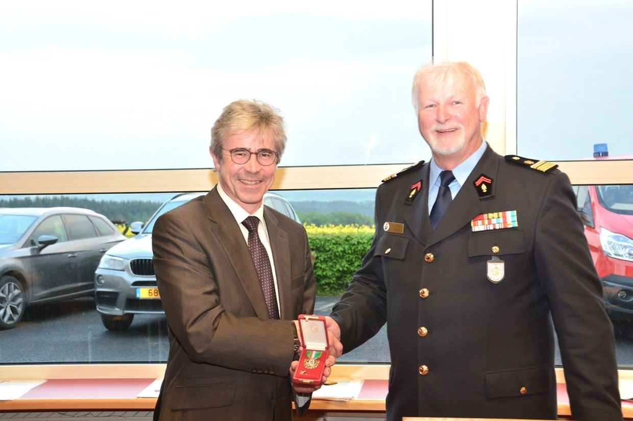 Eine besondere Ehrung wurde anschliessend H Paul Denzle , seines Zeichens Direktor der Firma ELTRONA zu teil. Für sein langjähriges Engagement zur Unterstützung des Kantonalverbandes Redingen und Regionalverbandes NORD, erhielt er von Patrick Juncker in seiner Eigenschaft als Vize-Präsidenten des Luxemburgischen Landesfeuerwehrverbandes die Ehrenmitgliedsmedaille des Verbandes alsdann der Bürgermeister der Gemeinde Wahl Marco Assa nach einigen Begrüssungs-und Dankesworten auf den Umtrunk einlud.