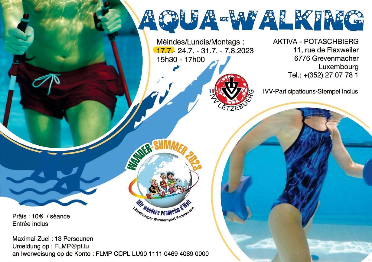Grevenmacher GREVENMACHER AQUA-WALKING mat IVV-Participatiouns Stempel inclus 31 juil. 2023 31 juil. Voir Plus 31 juil. Pia Kintziger Publié le lundi 3 juillet 2023 à 20:15 Grevenmacher, Luxemburg Fédération Luxembourgeoise de Marche Populaire an Zesummenaarbecht mat AKTIVA AQUA-WALKING vun 15h30 - 17h00 Adresse: AKTIVA-POTASCHBIERG 11, rue de Flaxweiler L-6776 GREVENMACHERTél.: +352 27 07 78 1 Präis: 10,00 € / séance/ mat IVV Participatiouns-Stempel inclus Maximal-Zuel: 13 Persounen UMELDUNG OP: flmp@pt.lu mat der Iwerweisung op de Konto FLMP:CCPL LU90 1111 0469 4089 0000 Signaler contenu inapproprié Plus de nouvelles de Pia Kintziger > LANDESKONGRESS DER LUXEMBURGER WANDERSPORTFEDERATION FLMP 15/03/23 Larochette FLMP BRAINSTORMING VUM 07.10.2022 08/10/22 Luxembourg - Cents 3. FLMP-Marathon „Zu Fouss op d’Fouer“ 04/09/22 Luxembourg-Ville LANDESKONGRESS DER LUXEMBURGER WANDERSPORTFEDERATION FLMP 02/03/22 Gilsdorf 50 Jahre Luxemburgischer Wandersportverband FLMP 28/11/21 Junglinster
