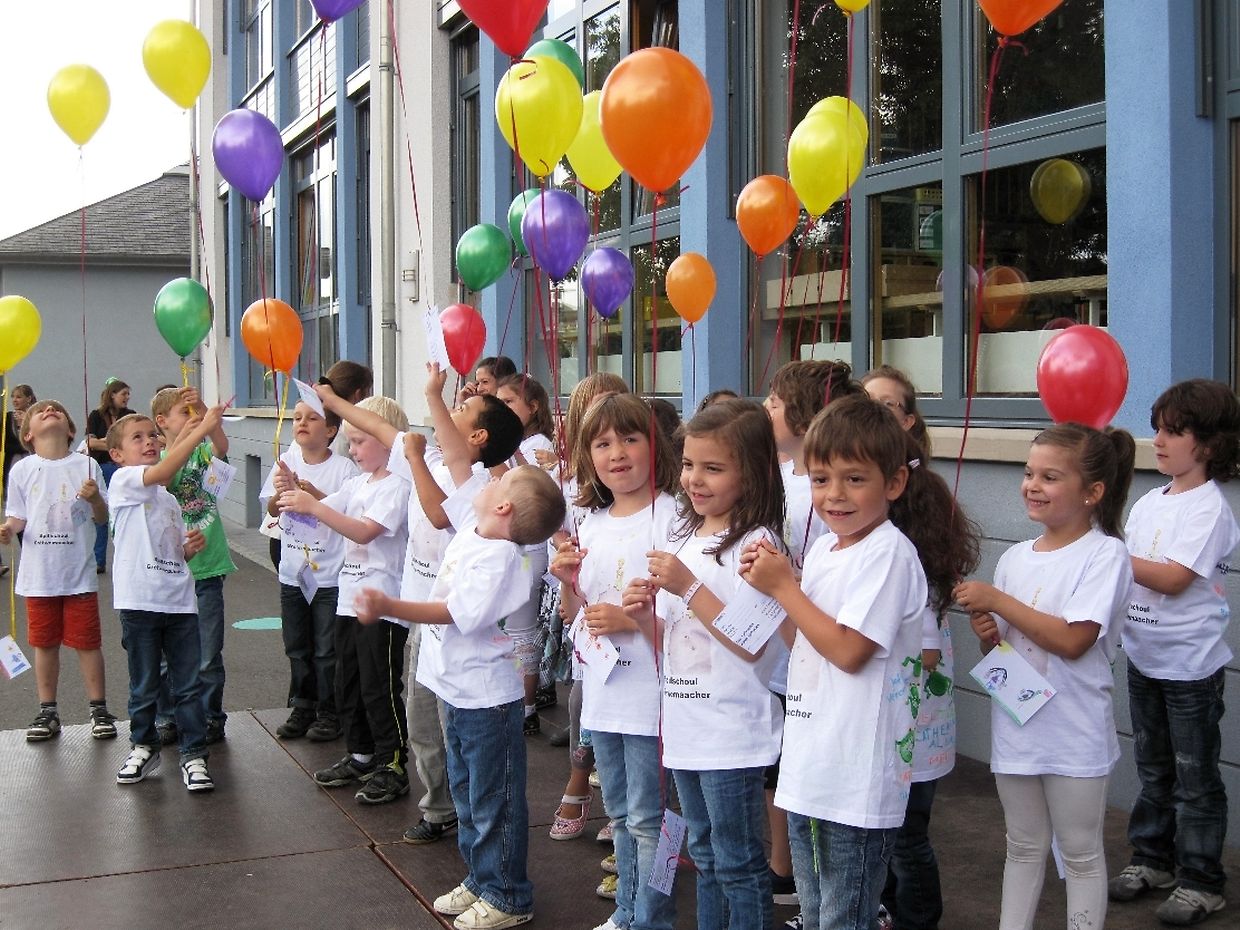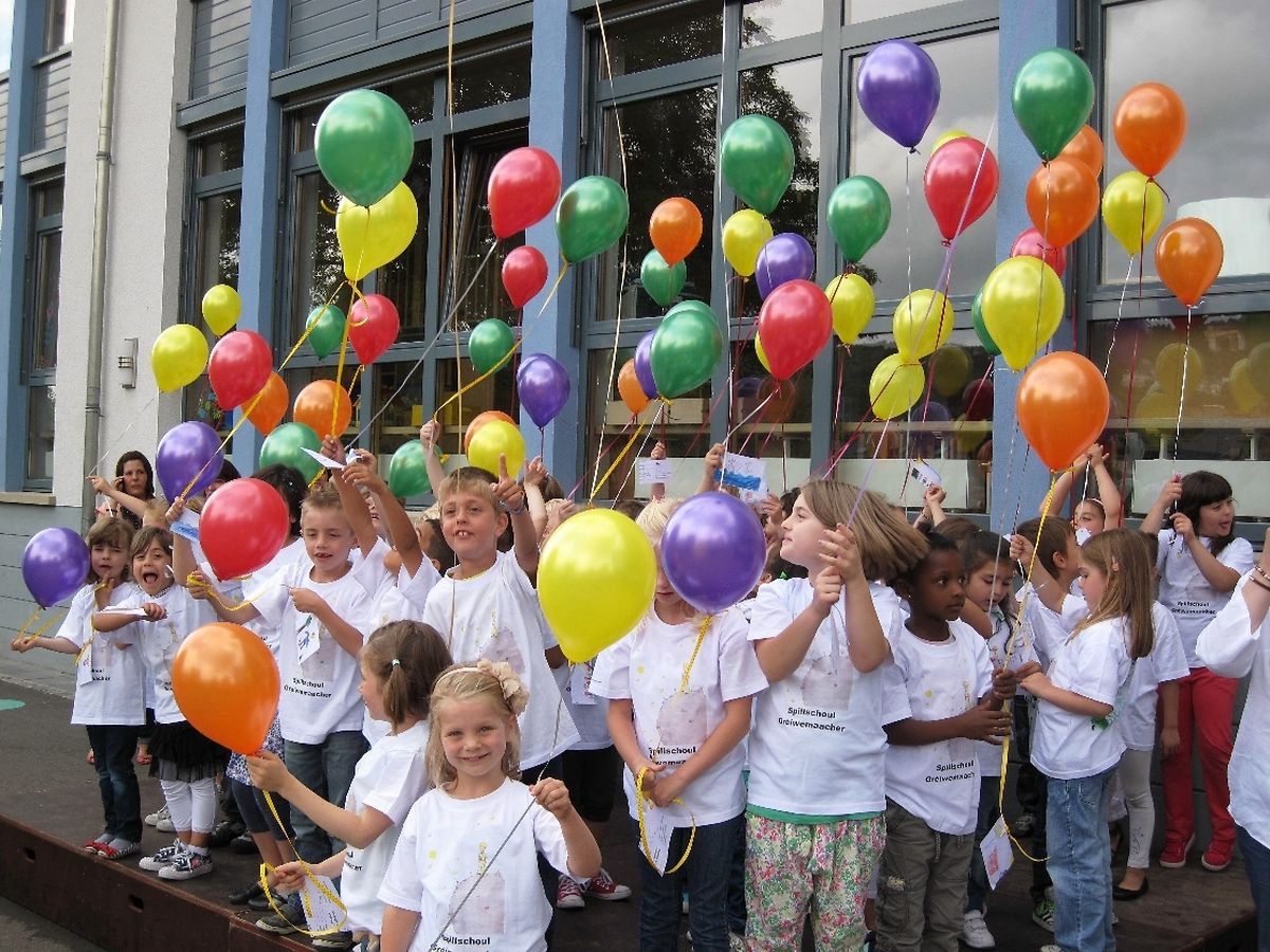 An zum Schluss sinn aus dem Spillschoulshaff vu Gréiwemaacher aus ganz vill faarweg Loftballonen an déi grouss, wäit Welt geflunn, wuel och als Zeeche vun där verdingter Vakanz, déi elo virun der Dir steet...