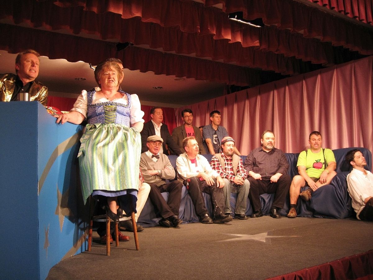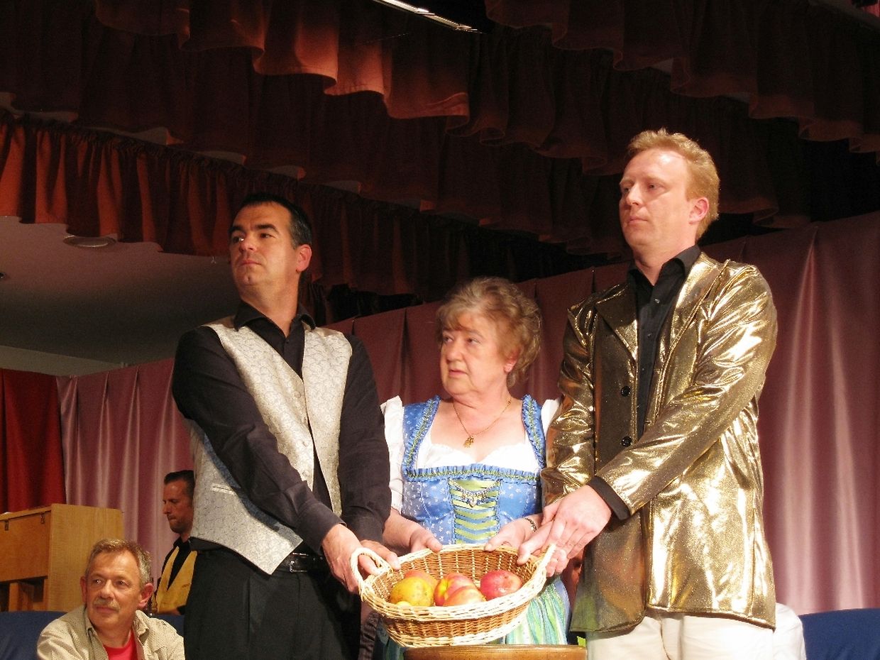 A wat huet dee Schwäizer Nationalheld Tell dann iwwerhaapt zu Maacher op enger Bühn verluer? Oppositioun ass ugesot, an zwar vun de Kandidate selwer, well "mir kënnen dach net einfach den Tell op Maacher an d'Kofferschmattsgässel verplanzen!" Wéi wär et mam Schéifermisch, deem vun do uawen? Dat wär wéinstens e Lëtzebuerger Nationalheld - mengt natierlech och d'Publikum... Awer domat si weder de Komponist nach d'Äppelfra averstan. Deen ee misst seng Musek ëm schreiwen, déi aner kënnt hir Äppel net méi feelbidden... O, wat eng elle Welt!