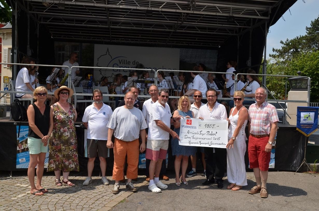 Bei Geleeënheet vun hirem Summerfest, ufanks Juli op der Schiltzeplaz zu Gréiwemaacher, hunn d'Harmonie Municipale an aner Musikgesellschaften aus den In- an Ausland net nëmme mat ville gefällege Weisen opgewaart. De Präsident Georges May an eng Parti Comitésmembere konnten och e Scheck iwwer 1.000 Euro un d'Präsidentin Muschi Silbereisen mat Comitésmembere vun der Amicale Foyer Pietert vu Maacher iwwerreechen. Dës Zomm ass den Erléis vun deem flotte Fréijoarsconcert 2015, deen zesumme mat der Musik aus dem hollänesche Venray zu Maacher gespillt gi woar. Et sief drop higewisen, datt d'HMG scho ganz vill esou Geste gemaach huet an och an Zukunft drop hale wäert, dat ze maachen, fir esou hir Solidaritéit mat Mënschen ze beweisen, deenen et net esou gutt geet an en Zeeche vu Frëndschaft ze setzen.