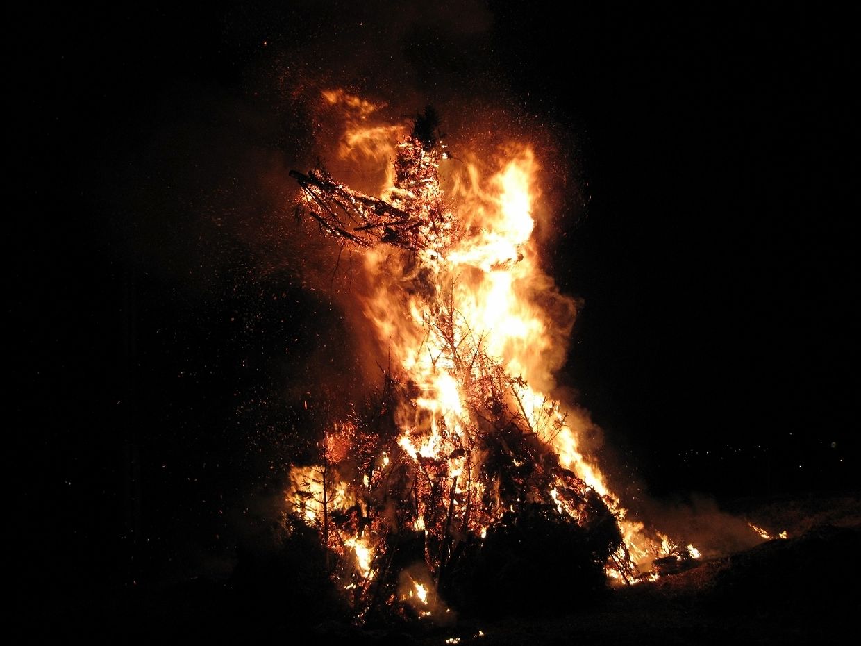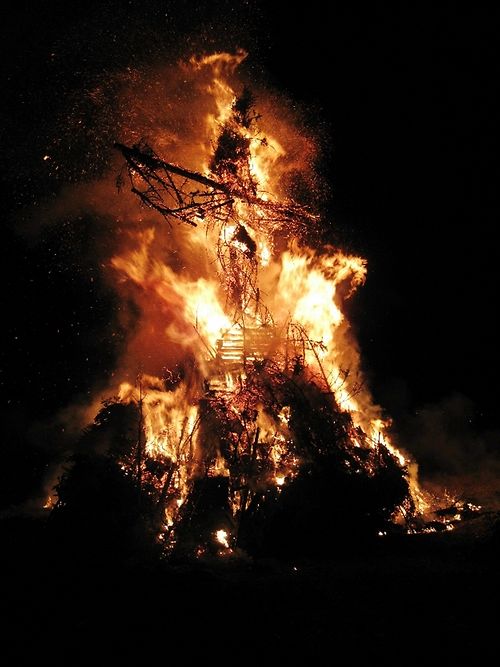 A kuerz duerno stoung déi stolz Buerg, déi de ganzen Dag mat vill Méi opgeriicht gi war, hell a Flamen, déi bis wäit iwwer Maacher eraus geliicht hunn. Wann een awer aus der Richtung vum Damp d'Wieder fir déi nächst Zäit hätt missen ofliesen, wär ee schlecht dru gewiescht, well deen ass esouzesoe riicht d'Luucht aus gaang.