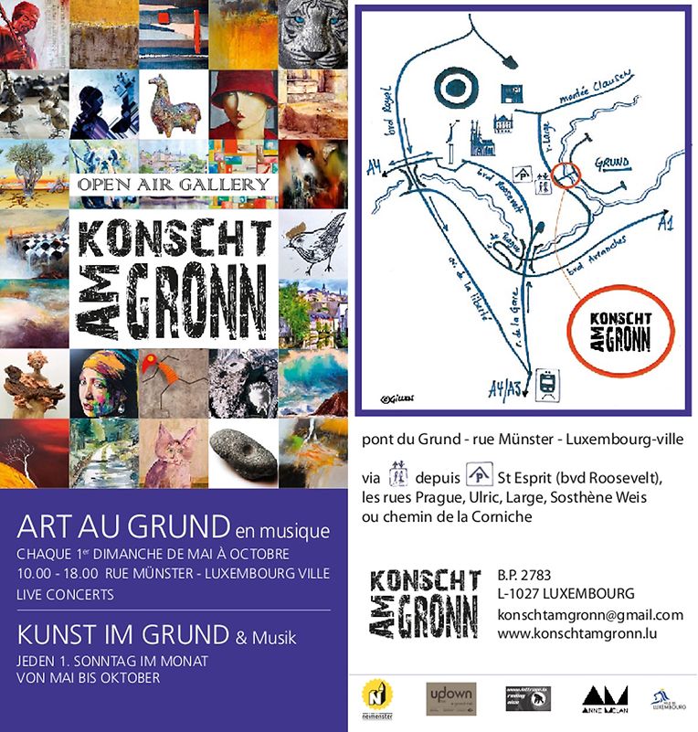 « Konscht am Gronn » ist eine Ausstellung unter freiem Himmel auf der berühmtesten und schönsten Brücke im historischen Stadtviertel "Grund“. Internationale Künstler stellen Ihre Werke jeden 1.sten Sonntag im Monat von Mai bis Oktober von 10h00-18h00 aus. Bilder, Zeichnungen, Skulpturen aus Holz, Stein, Metall und Keramik, Fotographie, Glas- und digitale Kunst.
