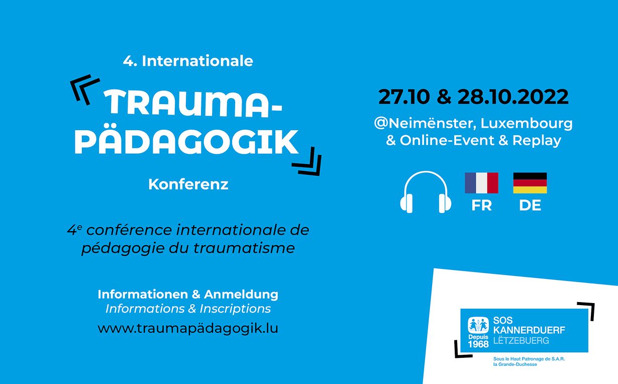 Am 27. und 28. Oktober organisiert SOS Kannerduerf Lëtzebuerg die vierte Ausgabe der internationalen Traumapädagogik-Konferenz. Dieses Jahr wird Prof. Marie Anaut zum Thema "Lachen als Zufluchtsort gegen das Leiden? Humor, Trauma und Resilienz" sprechen und Prof. Dr. Menno Baumann referiert über "Krisenintervention und Handlungsspielräume – Das Gegenteil von Scheitern ist Handeln !" Die Vorträge werden in deutscher und französischer Sprache gehalten und richten sich an Menschen, die beruflich oder privat mit traumatisierten Kindern und Jugendlichen zu tun haben: Erzieher, Sozialarbeiter, Lehrer, Krankenschwestern, Pädagogen, Pflegefamilien, Adoptivfamilien, Ärzte, Polizisten und Rechtsanwälte.