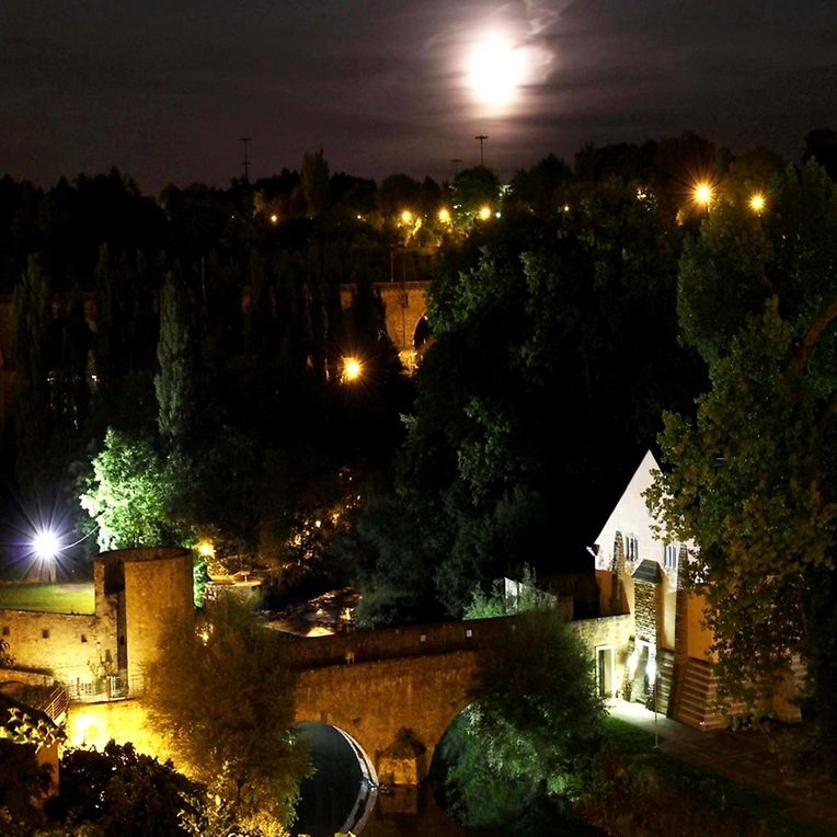 Well ech en passionéierten Fotograph sinn, ginn ech muenchmol owes Fotoe vun der Aalstaat maachen. Ech hunn vun der Schlassbréck eng erof op Wenzelbréck gemat, et war bal Stack däischter, nëmmen de Mound an déi puer Scheinwerfer ënnen bei der Bréck hunn Landschaft beliicht.