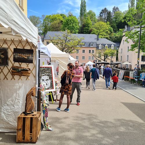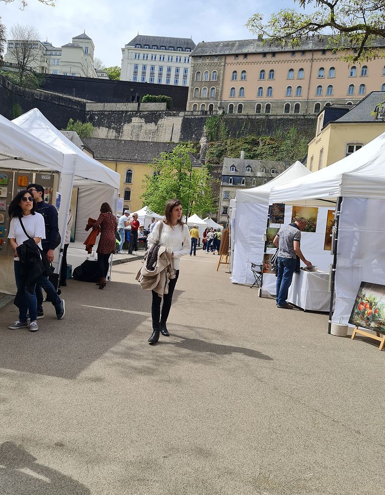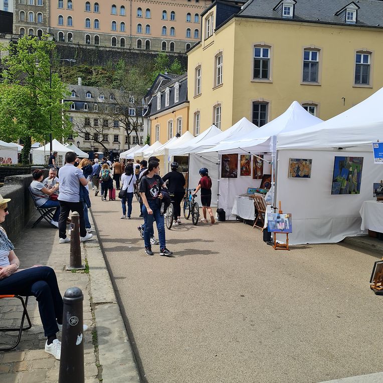 Nous sommes installés au Grund dans la rue Münster, près de la sortie de l'ascenseur qui relie la Ville Haute au Grund. Sur et aux alentours du fameux pont qui surplombe l’Alzette, une pléiade d’artistes internationaux dévoilent leurs œuvres récentes et proposent d'acquérir des créations originales telles que sculptures, peintures, art du verre, photographies, gravures, dessins, tout en dialoguant avec petits et grands. 1 concert sera offert au public à partir de 14.00 heures > Stairs or Elevator