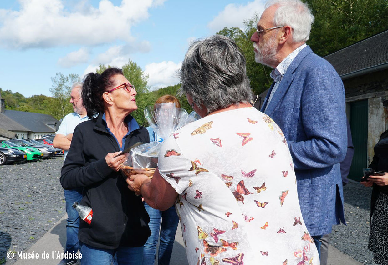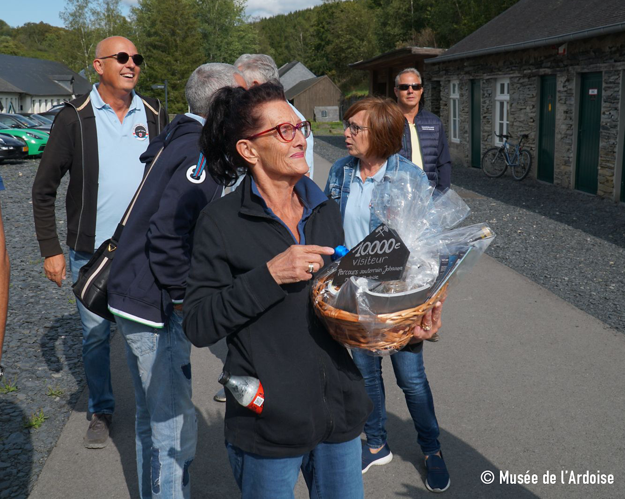 Dès lors, le Musée de l’Ardoise est fier d’annoncer qu’en date du 27.08.2023, lors du créneau de 15h00, le 10.000ième visiteur a passé le tourniquet du parcours souterrain avec son ticket d’entrée. Marco Schank, président du ‘Musée de l’Ardoise asbl’, Agnes Hoogenhout, présidente de ‘Les Amis de l’Ardoise asbl’ et membre du Conseil d’Administration, ainsi qu’Alexia Cammaert, agent touristique du ‘Musée de l’Ardoise asbl’, ont eu l’honneur d’offrir la corbeille du 10.000ième ticket, le dimanche 27.08.2023 à Madame Christine Diederich. Madame Diederich, originaire de Mersch, participait alors à une visite guidée du Musée de l’Ardoise et de son parcours souterrain, avec le groupe ‘Amis Porsche Luxembourg’, dont elle est également membre.