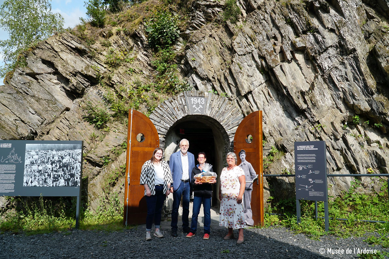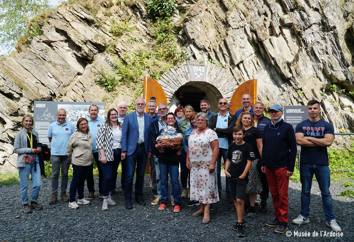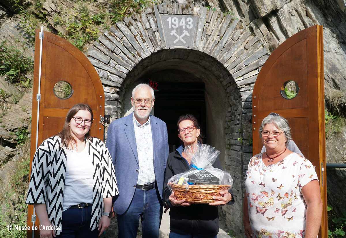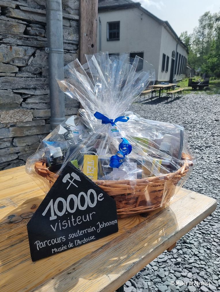 Les tickets vendus, soit à des visiteurs autonomes, soit dans le cadre de visites guidées ou lors de visites pédagogiques, font l’objet d’un comptage précis. Pour célébrer le moment spécial du passage du 10.000ième visiteur dans le nouveau parcours souterrain, le Conseil d’Administration du Musée de l’Ardoise asbl a décidé d’offrir une belle corbeille composée par le ‘Naturpark Öewersauer’ (Esch s/ Sûre) renfermant des produits du parc (aliments, cosmétique, draperie), d’une valeur de 100 euros.