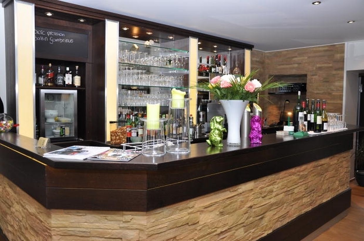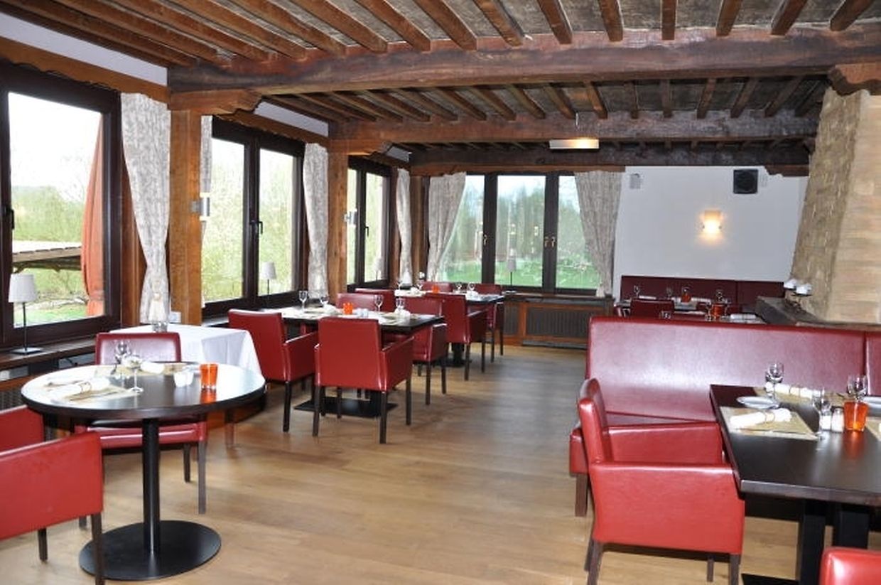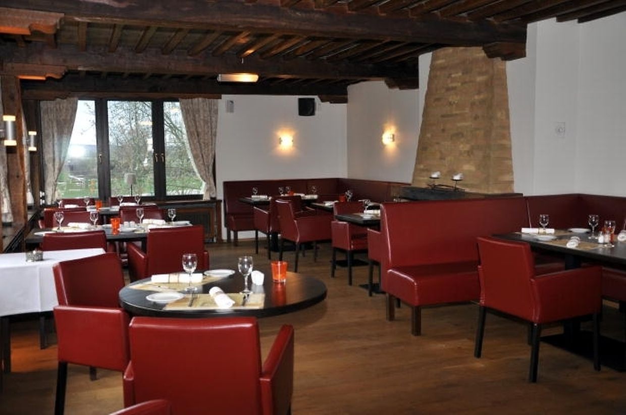 Das Restaurant mit Platz für 75 Gäste präsentiert sich im modernen schlicht eleganten Look und besticht mit seinen roten Ledersesseln und dunklen Holztischen. Ein separater Raum bietet zusätzliche 40 Plätze für Familien- oder Firmenfeiern. Direkt am Eingang des Restaurants lädt die Cocktailbar zum gemütlichen Aperitif oder Weinverkostung ein. Geradezu ideal, um Urlaubsfeeling aufkommen zu lassen und vom Alltag zu entspannen ist die idyllisch am Ufer der Alzette gelegene Terrasse mit Ausblick auf den „Hesper Park“, die noch zusätzlich Platz für 75 Gäste bietet.