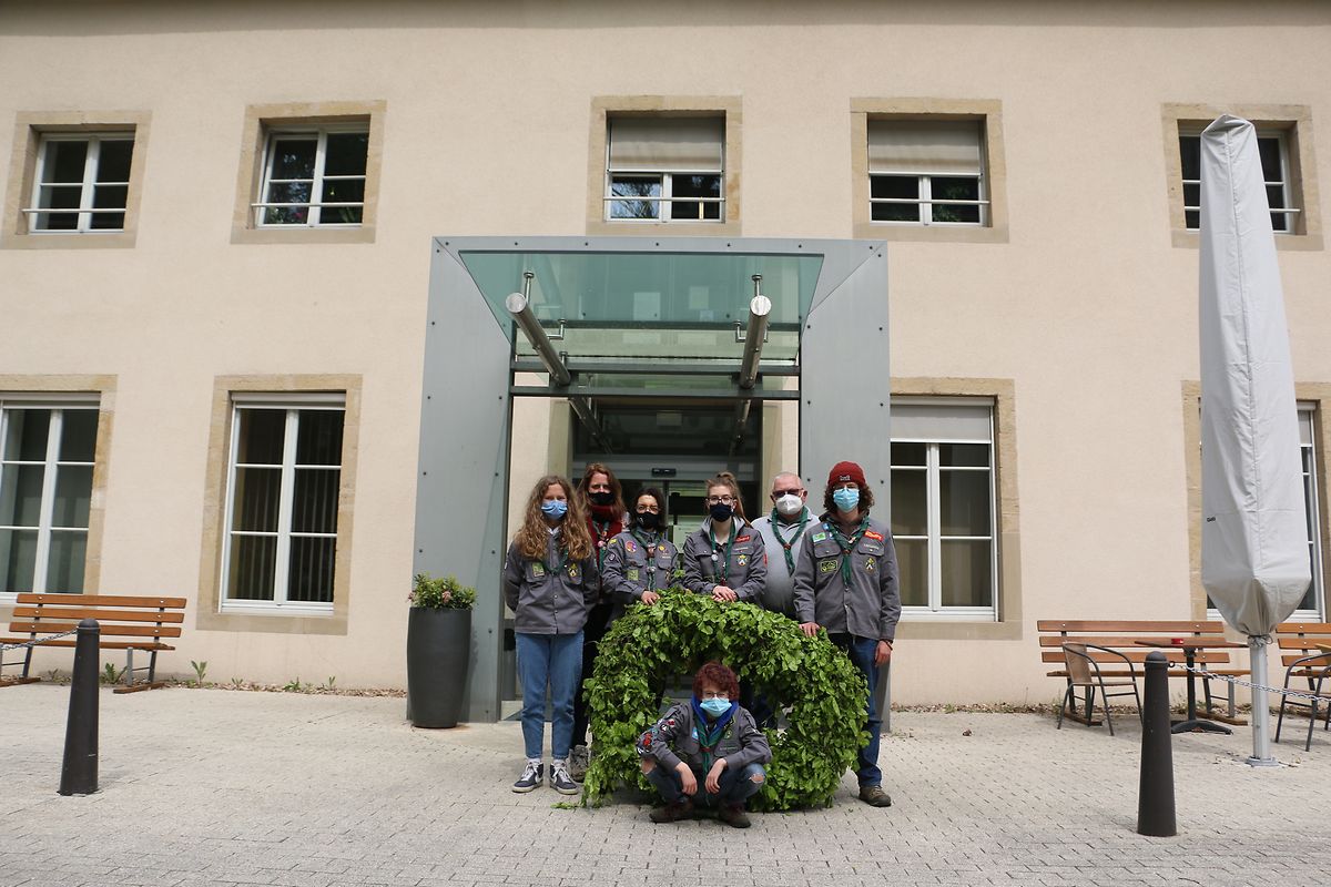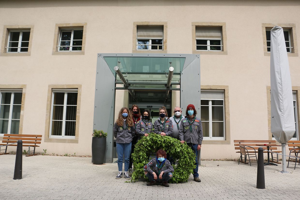 Am Bësch ass e flotten Meekranz aus dem éischten Grengschnatt vun den Beem gebonnen ginn. Dësen Meekranz hunn mir mat enger ganz klenger Delegatioun vun maximal 3 Leit, an ënnert striktem anhalen vun den Schutzmoossnamen an Altersheem bruecht, an och opgehaangen an esou bëssen néi Freed an Heem bruecht. Ons léif Leit aus dem Hospice Civile Pfaffental, hunn mir ni vergiess. Ons bei den HoGa Scouten & Guien sinn net just déi Jong Memberen, mee och déi méi eeler Generatioun eben wichteg, an mir wëllen hoffen, dat mir Sie all Gesond a Monter erëm gesinn.