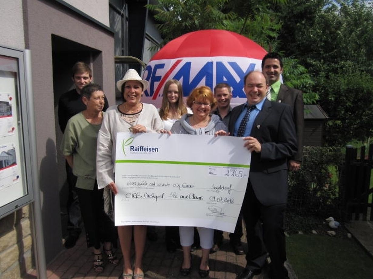 Im Rahmen einer Feierstunde überreichte Paul Feller, Inhaber des Immobilienbüros Re/Max Premium in Ingeldorf, einen Scheck über 2 165 Euro an die Vereinigung „Ile aux clowns“.