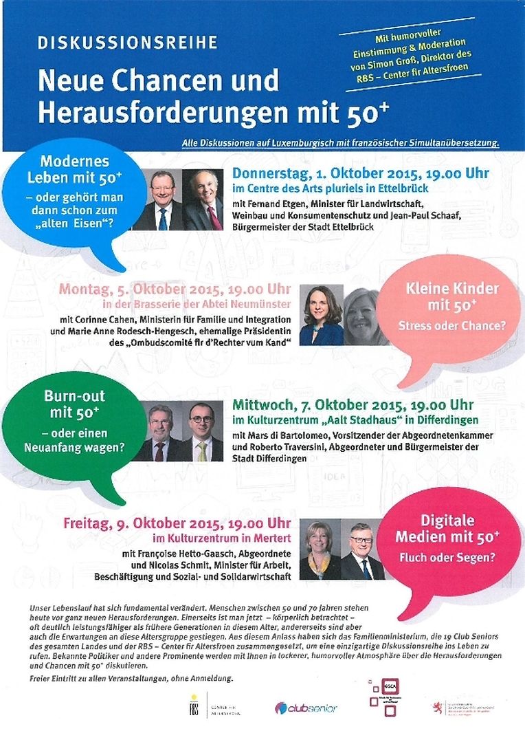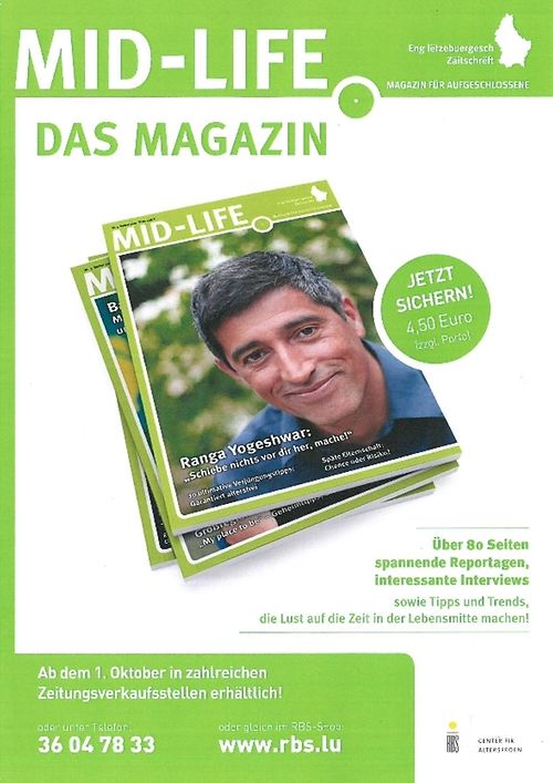 Nur noch wenige Wochen, dann erscheint das Luxemburger Magazin "MID-LIFE". Dort können Sie lesen, wie Ranga Yogeshwar das Alter sieht und was Jean Asselborn bewegt. Parallel zum Erscheinungsdatum organisieren das Familienministerium, die 19 Clubs Seniors und der RBS - Center fir Altersfroen in den ersten zwei Oktoberwochen eine so noch nie dagewesene Diskussionsreihe mit bekannten Persönlichkeiten. An vier Abenden können Sie mitdiskutieren zu Themen der Lebensmitte von heute. Dort erhalten Sie auch das neue MID-LIFE. Sollten Sie keine Zeit haben, es ist in vielen Zeitungsgeschäften erhältlich, bei uns in Itzig oder über unseren Internet-Shop.