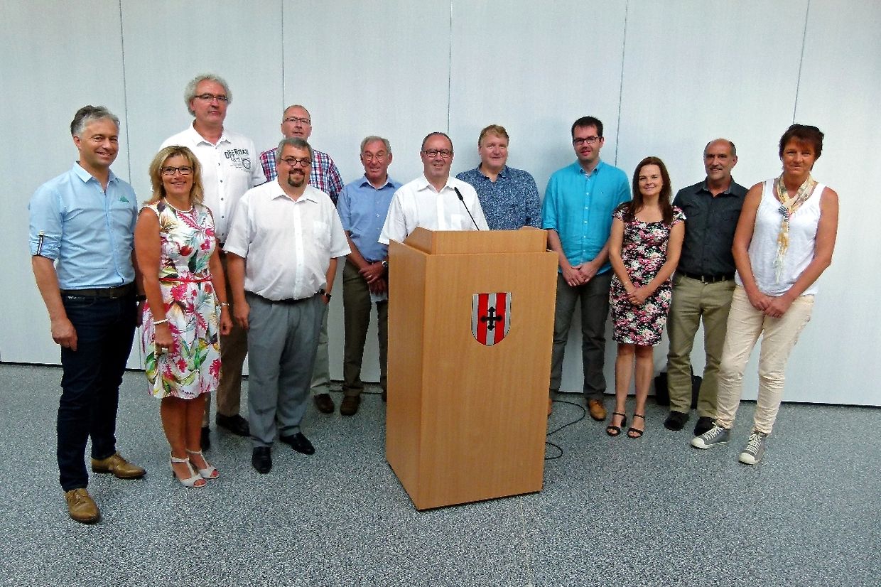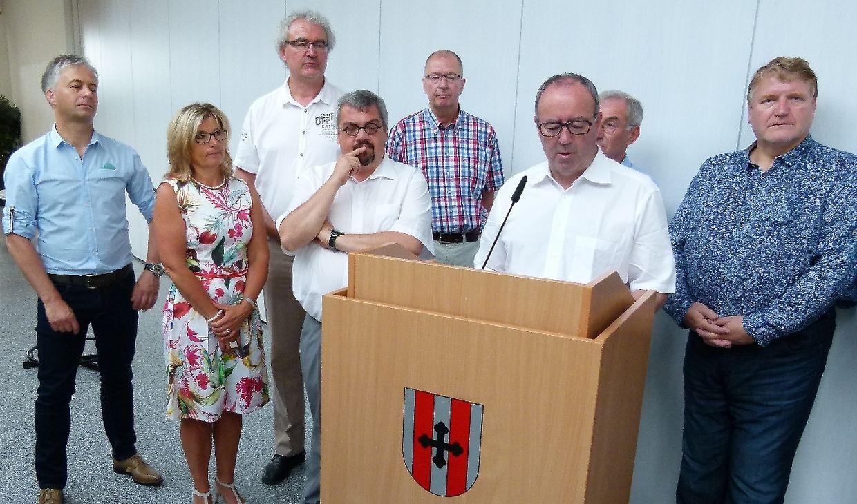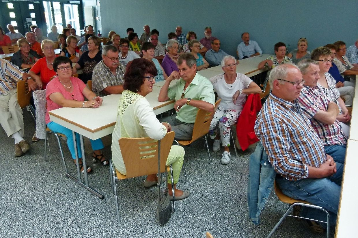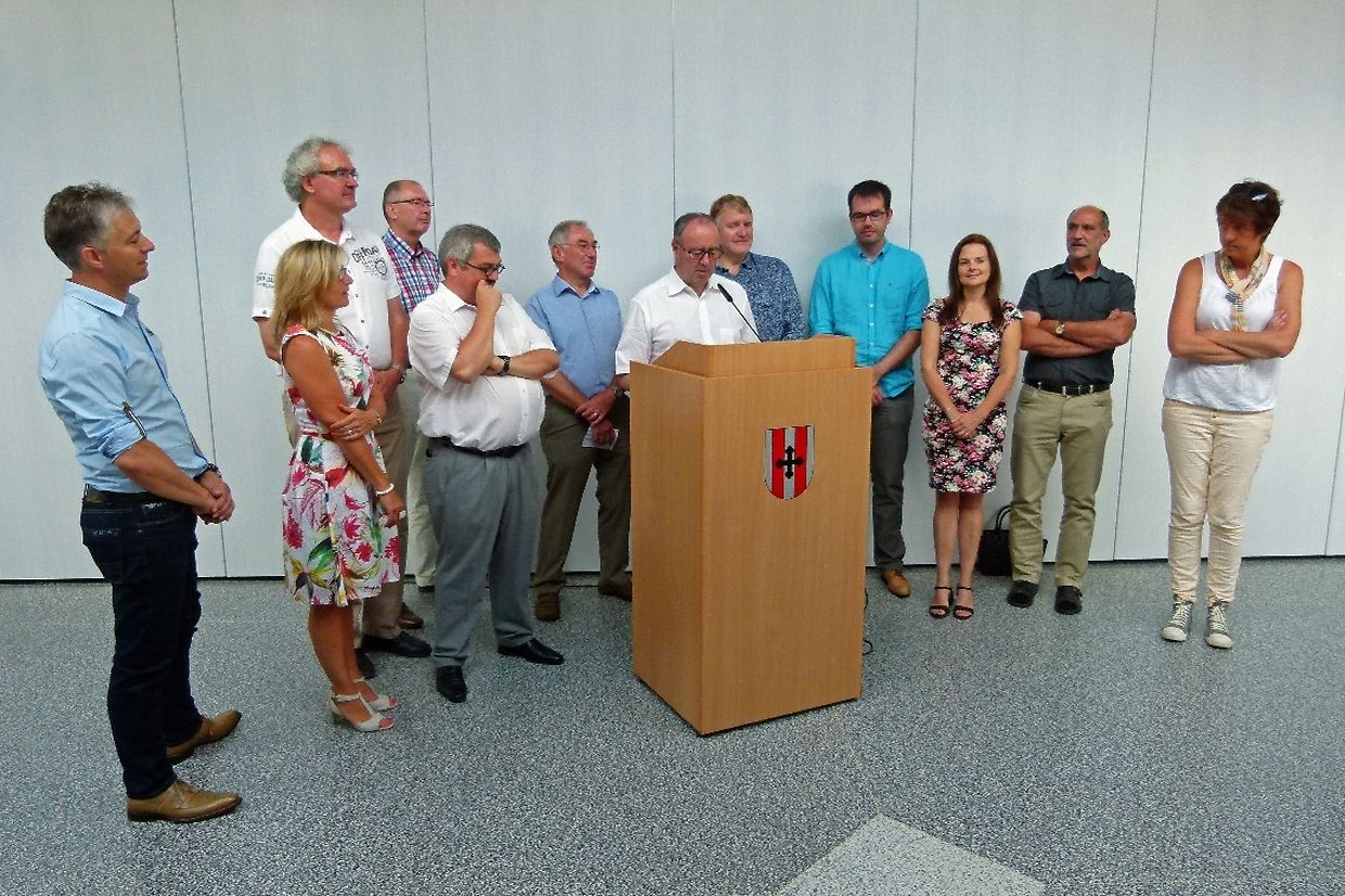 Am Sonntag war die Reihe an Junglinster, dieses Partnerschaftstreffen zu organisieren. Um 10.30 Uhr wurden die rund 50 Gäste aus der Eifel sowie die einheimischen Teilnehmer in der Mehrzweckhalle Gaston Stein vom Bürgermeister Romain Reitz empfangen, der kurz auf die Entwicklung der Gemeinde seit dem letzten Treffen einging. Er hob dabei besonders die neue Umgehungsstraße hervor und ging auf die geplante Umgestaltung des Zentrums von Junglinster ein. Dieses Projekt betreffend hob er hervor : « Was uns als Gemeidevertreter sehr viel bedeutet,, ist der große Mehrwert an Lebensqualität innerhalb des Hauptortes der Gemeinde. Das Gelände von 3,5 ha, das im Moment eine große Baustelle darstellt, werden Staat und Gemeinde kurz- bzw. mittelfristig in Bauland umwandeln, wo dann rund 150 neue Wohneinheiten entstehen. Dieses ehrgeizige Projekt wird im Zeitraum 2016 bis 2022 realisiert. »