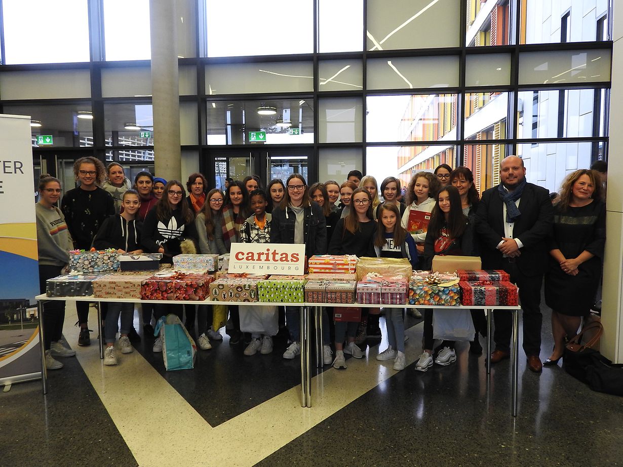 Zahlreiche Klassen haben sich an diesem Projekt beteiligt. Am 6 Dezember fand eine offizielle Überreichung der Weihnachtskisten an „Caritas Luxembourg“ statt.