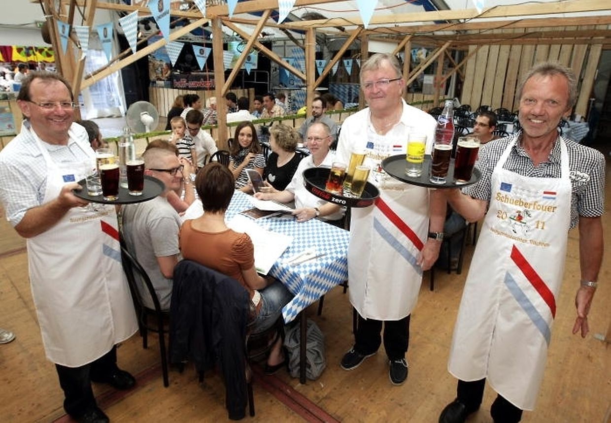 Die Bürgermeister Nico Marechal (Vichten), Fernand Diederich (Colmar-Berg) und Fernand Etgen (Feulen) traten ihren außergewöhnlichen Dienst gegen 17.30 Uhr im Restaurant „Am Stall“ an. Fernand Etgen und Nico Marechal kellnerten zum ersten Mal auf der „Fouer“, als Bürgermeister zumindest. „Als Vereinsmensch habe ich Erfahrung im Kellnern. Das fällt mir nicht schwer“, sagte Fernand Etgen, der auf die Unterstützung seines Feulener „Supporter-Clubs“ zählte.