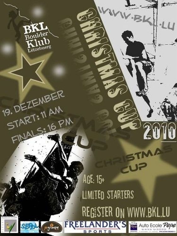 Sonndes, den 19. Dezember 2010 ass um Lampertsbierg an der Boulderhal an der Primärschoul Henri VII den 1. CHRISTMAS-BOULDERCUP, organiséiert vum BOULDER KLUB LËTZEBUERG.