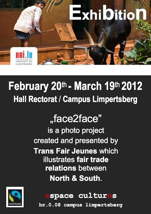 Die Fotoausstellung Face2Face der Jugendgruppe TransFair Jeunes ist wieder an einem neuen Ort zu besichtigen. Zwischen 20. Februar und 19. März 2012 können Interessierte die Expo im Saal vor der Direktion im Hauptgebäude am Campus Limpertsberg besichtigen. Die Räumlichkeiten sind zwischen 10:00 und 17:00 Uhr für Besucher geöffnet.