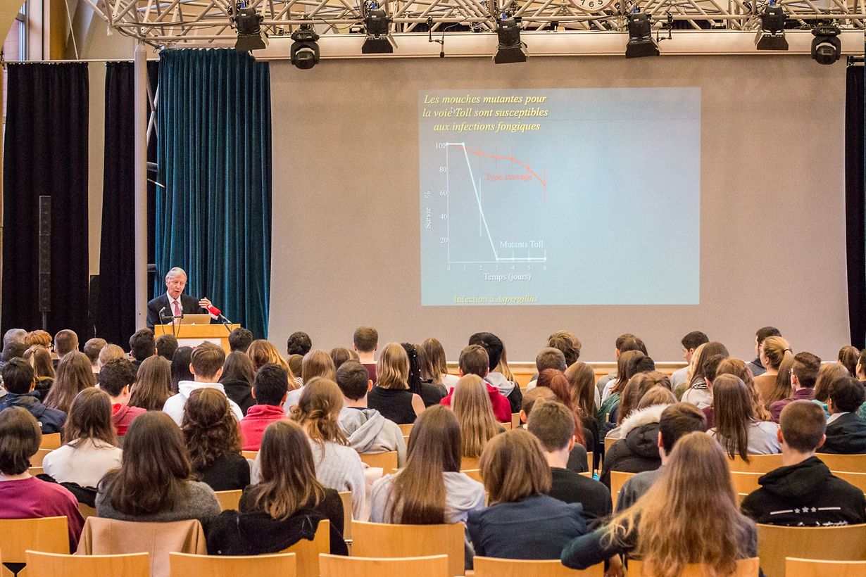 Le vendredi, 12 janvier 2018, les élèves des classes de 3me, 2me et 1re C du LGL ont eu l’immense privilège de pouvoir rencontrer un éminent ancien élève de notre lycée, scientifique de renommée internationale : Jules Hoffmann, lauréat du Prix Nobel de médecine en 2011 et membre de l’Académie française.