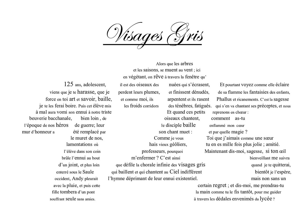Étant donné que le LGL a fêté ses 125 ans tout au long de l’année, il a été demandé aux élèves de créer un calligramme avec comme sujet principal l'année du 125e anniversaire du Lycée de Garçons de Luxembourg. Cela n’était pas une mince affaire, mais les participants ont réussi à montrer leur créativité ainsi que leur motivation afin de réaliser un poème sortant tout à fait de l’ordinaire.