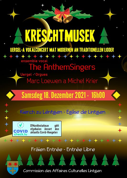 E flotte Krëschtconcert mat modernen an traditionellen Lidder, fir iech bruecht vum ensemble vocal "The AnthemSingers", an den Organisten Marc Loewen an Michel Krier.