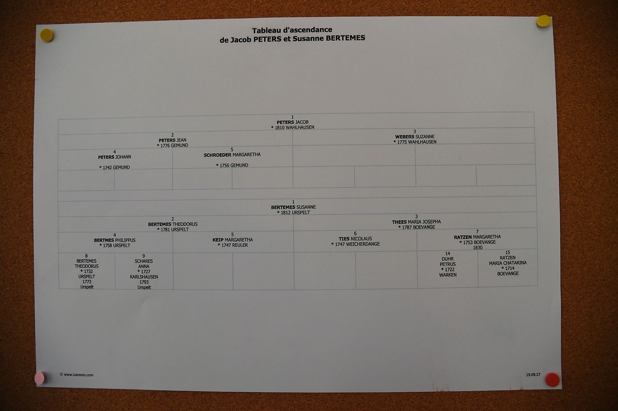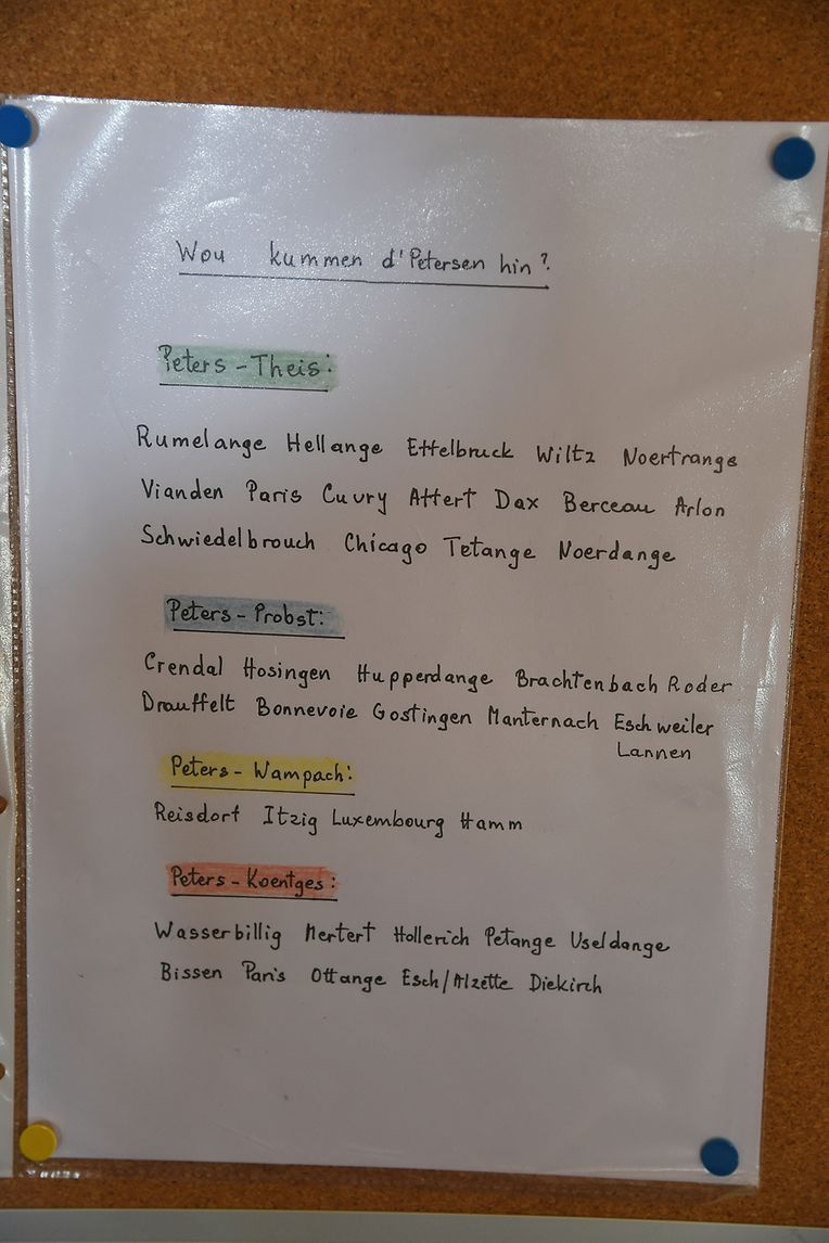 Lipperscheid: Auf Einladung von Léon Lamborelle, Christiane Krier- Peters, Hortense Bohler- Haas, Jeanne und Bert Peters trafen sich vor kurzem die Nachkommen der Familie Peters- Bertemes im Restaurant Leweck in Lipperscheid. Jacob Peters aus Wahlhausen und Susanna Bertemes aus Urspelt gaben sich das Ja- Wort am 18. November 1841 in der Pfarrkirche von Wahlhausen. Aus ihrer Ehe gingen fünf Söhne hervor. Insgesamt 73 Nachkommen, die sich bis heute noch nicht gekannt hatten, waren umso mehr erfreut, sich bei dieser einmaligen Gelegenheit auch kennen zu lernen. Nach dem gemeinsamen Mittagessen stießen die vielen gesammelten Dokumente und Familienfotos auf sehr viel Interesse. Beim Abschied herrschte Einigkeit ein solches Familientreffen in nächster Zeit erneut zu wiederholen. (TEXT/FOTOS: CHARLES REISER)